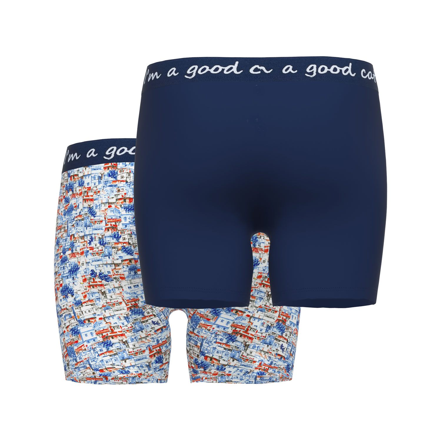 Elke verpakking bevat twee boxershorts, een boxer voorzien van huisjes patroon. De ander is effen blauw.