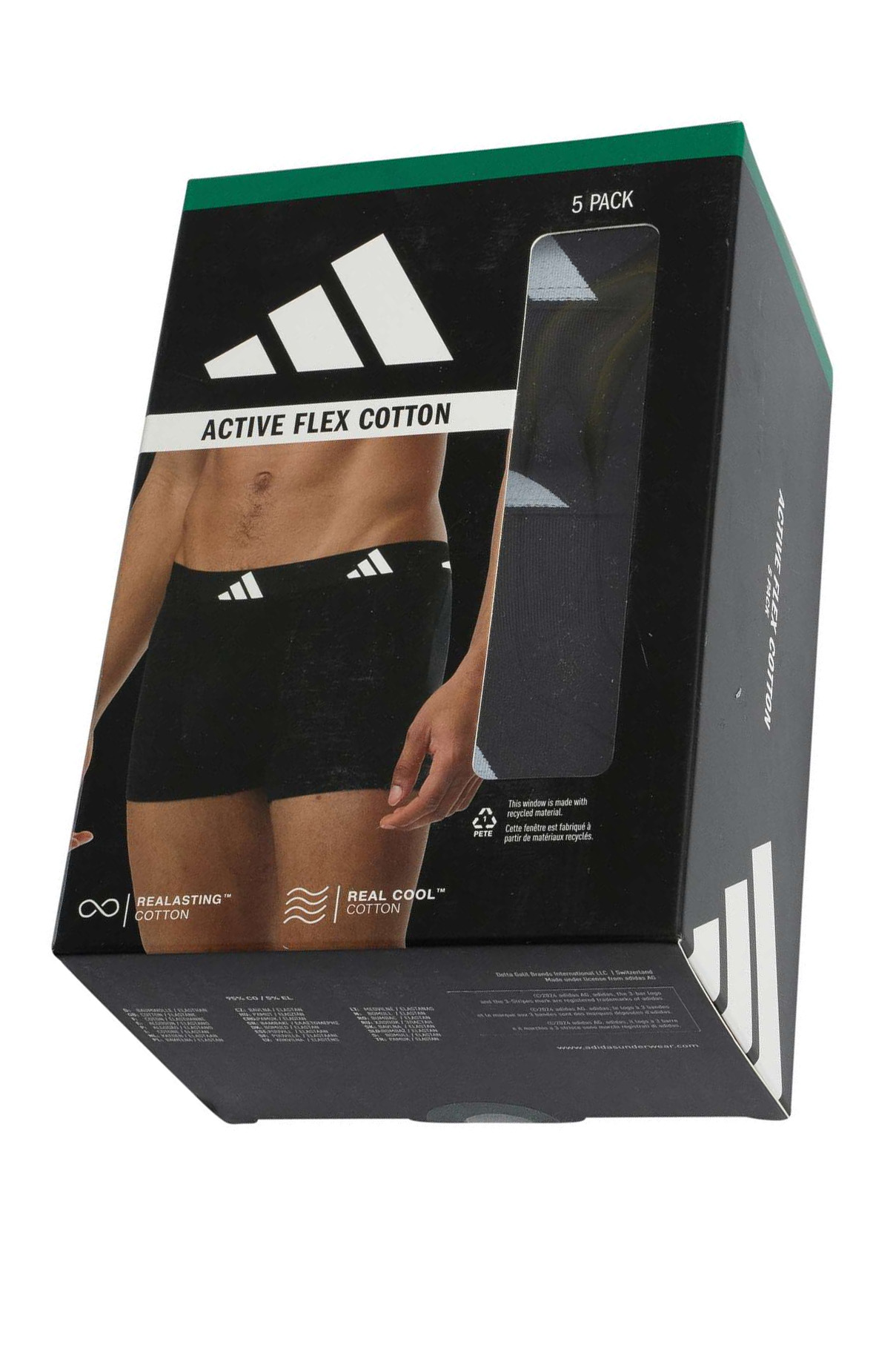 5-pack Adidas boxershorts Active Flex cotton. Deze boxershorts zijn gemaakt van stretch katoen. Deze boxershorts hebben een strakke pasvorm met voorgevormd kruis dat zorgt voor ultiem comfort. In deze verpakking zitten vijf effen boxershorts met een elastische tailleband waarin het Adidas logo te zien is.