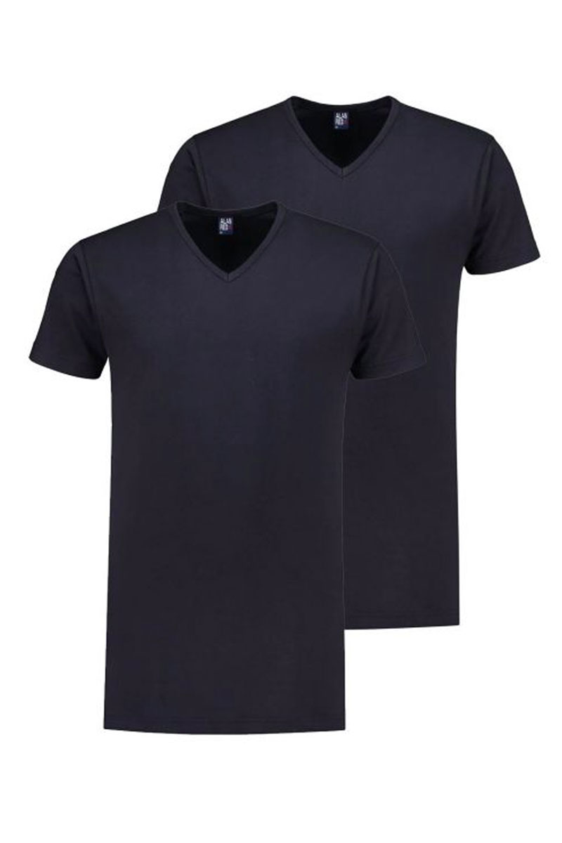 Alan Red Vermont T-shirts extra lang 2-pack. In de verpakking zitten twee effen donkerblauwe T-shirts. Het model Vermont kenmerkt zich door de rechte pasvorm, de smalle boord en V-hals. Perfect als ondershirt maar ook als basic V-hals T-shirt op een lente of zomerse dag. Dit T-shirt is gemaakt van 100% hoogwaardig katoen en hij is extra lang zodat het shirt altijd goed in je broek blijft zitten.