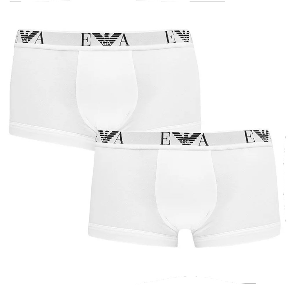 Verpakking met twee effen witte boxershorts met een elastische tailleband. In de tailleband is het EA merklogo verwerkt. De shorts zijn gemaakt van stretch katoen en dragen hierdoor comfortabel. Ook hebben ze een aansluitende pasvorm.