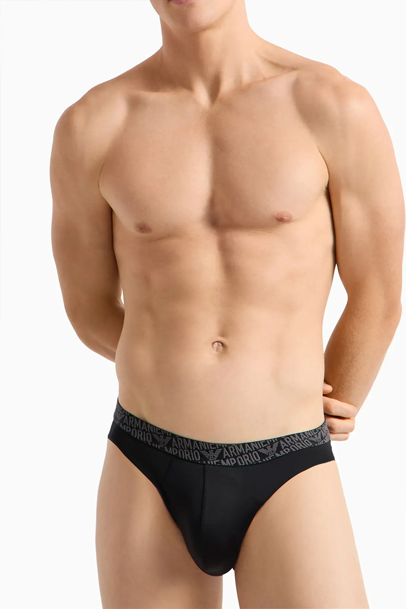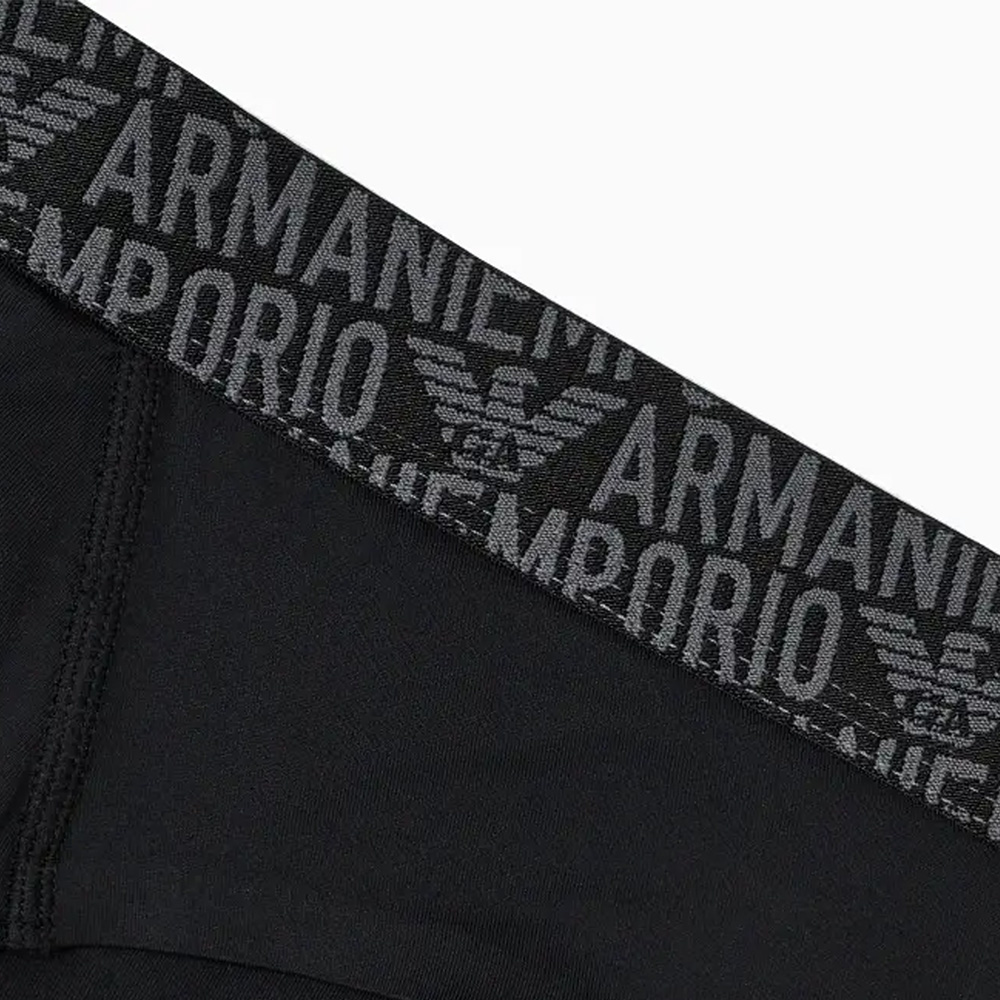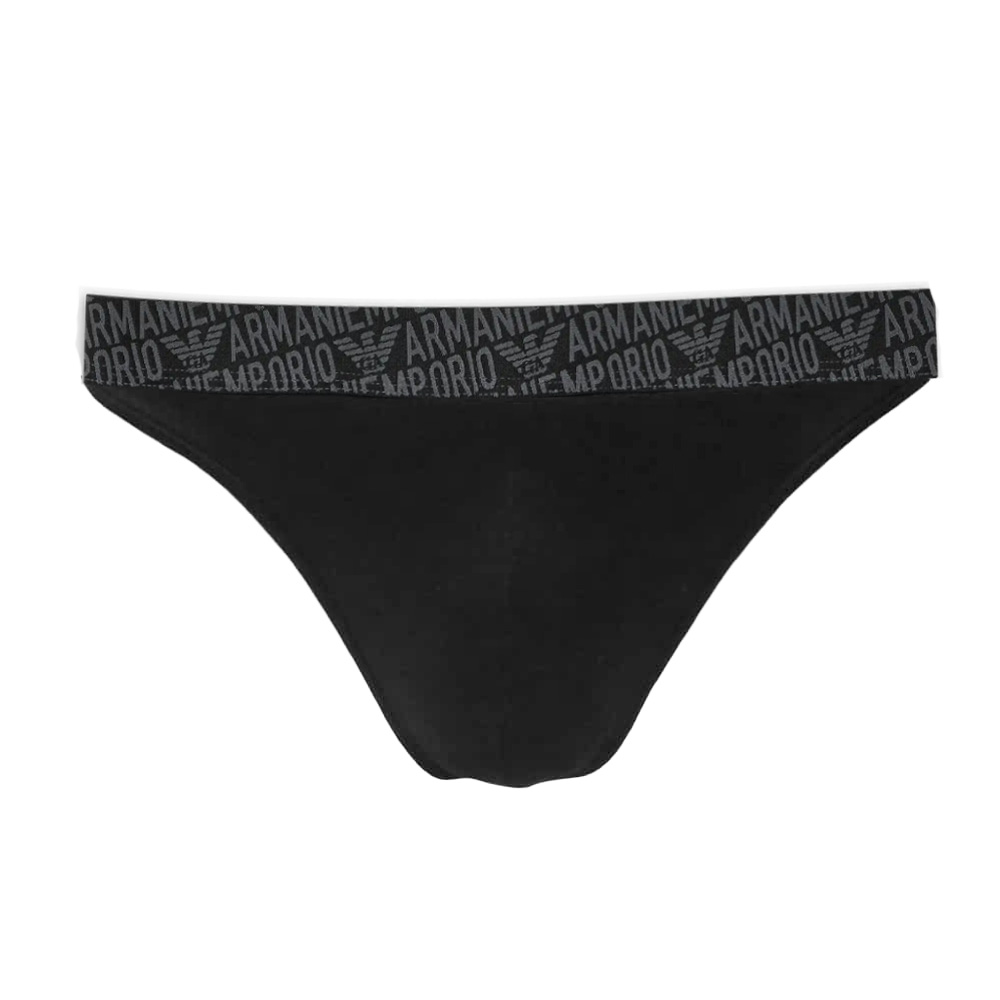 G-string string voor heren van Armani. In deze verpakking zit een effen zwarte G-string, die gemaakt is met een mooie elastische taille voorzien van Emporio Armani logo. Emporio Armani is in een contrasterende grijze kleur op het elastiek geweven. De g-string is gemaakt van elastisch microvezelmateriaal, waardoor hij licht en comfortabel is om te dragen.