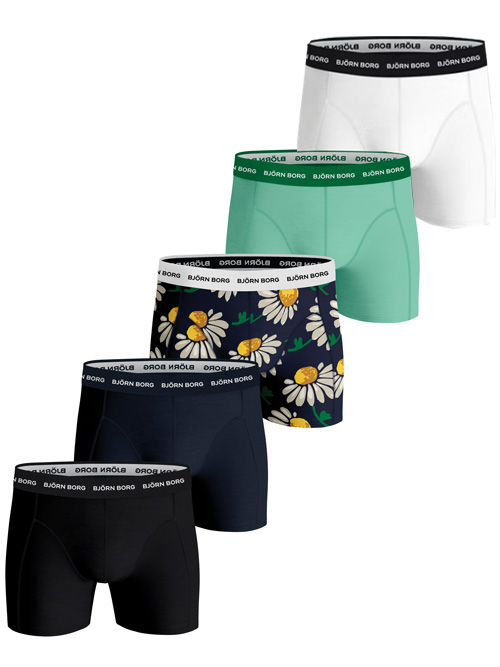 Met deze verpakking met vijf Bjorn Borg boxershorts ben jij weer voorzien van stijlvol ondergoed! In de verpakking zit een zwarte, een donkerblauwe, een groene, een witte en een blauwe met fleurige bloemen print. Ze hebben een comfortabele logo tailleband en halflange pijpen. Daarnaast zijn de boxershorts voorzien van een dubbel gelaagd kruis waardoor ze langer mee gaan.