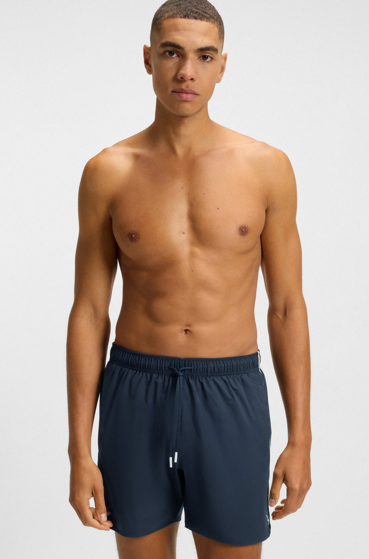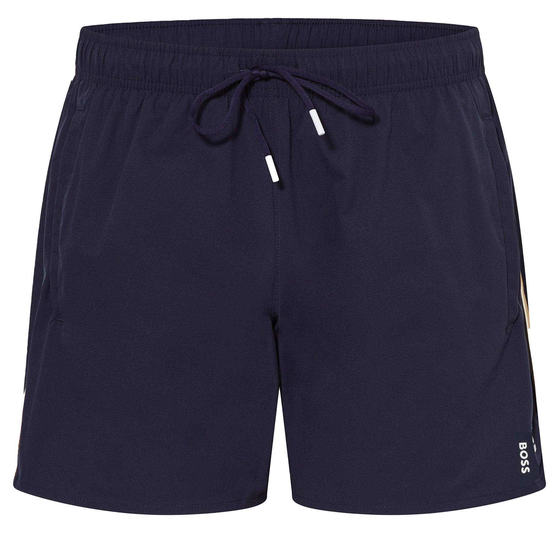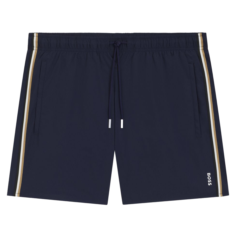 De zwemshort van BOSS is voorzien van een binnenbroek en een tailleband met wit koordje. Hij is zwart van kleur een heeft een wit Hugo Boss logo onderaan de linker pijp. Aan de zijkant loopt een zwart/beige/witte contrasterende lijnen.