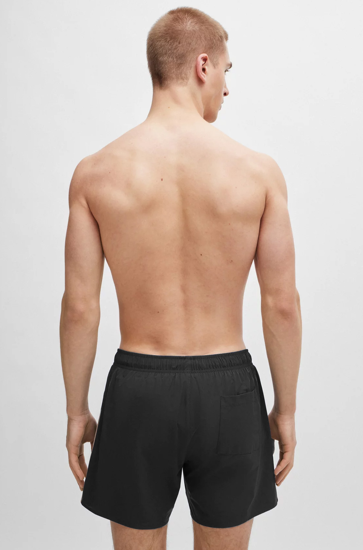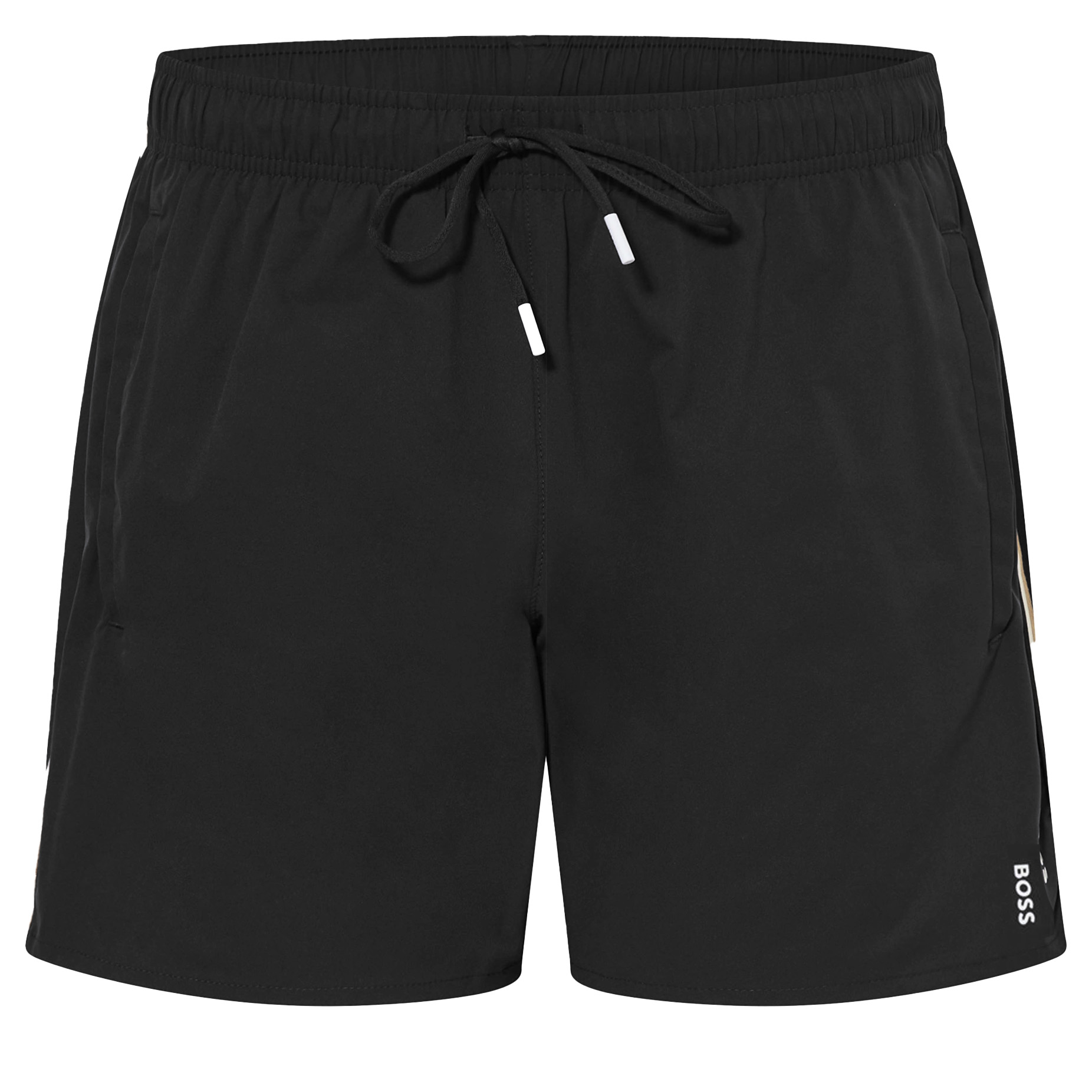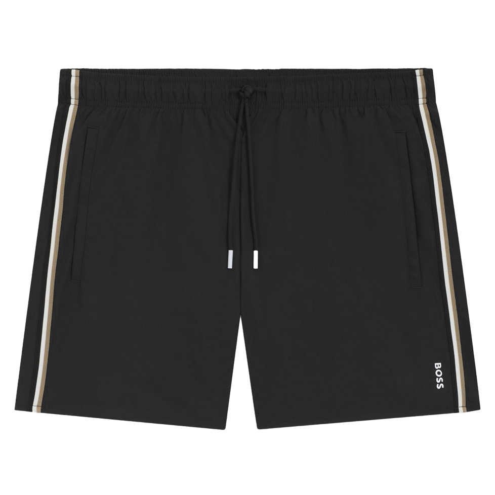 De zwemshort van BOSS is voorzien van een binnenbroekje en een tailleband met wit koordje. Hij is zwart van kleur een heeft een wit Hugo Boss logo onderaan de linkerpijp. Aan de zijkant loopt een zwart/beige/witte constrasterende lijnen.