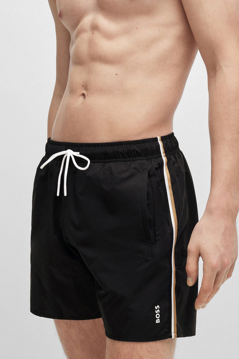 De zwemshort van BOSS is voorzien van een binnenbroekje en een tailleband met wit koordje. Hij is zwart van kleur een heeft een wit Hugo Boss logo onderaan de linkerpijp. Aan de zijkant loopt een zwart/beige/witte constrasterende lijnen.