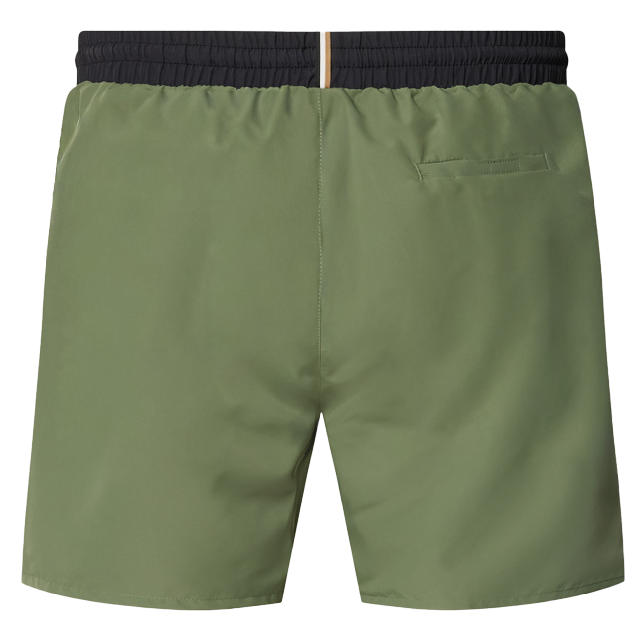 De zwembroek is effen van kleur en voorzien van het herkenbare BOSS-logo onderaan de linker pijp. Een subtiele bies langs de zijkant geeft de short een sportieve uitstraling. De zwembroek heeft een comfortabele tailleband met koordsluiting en een geïntegreerd binnenbroekje voor extra ondersteuning. Praktische steekzakken aan de zijkanten en een klein achterzakje bieden ruimte voor kleine items.