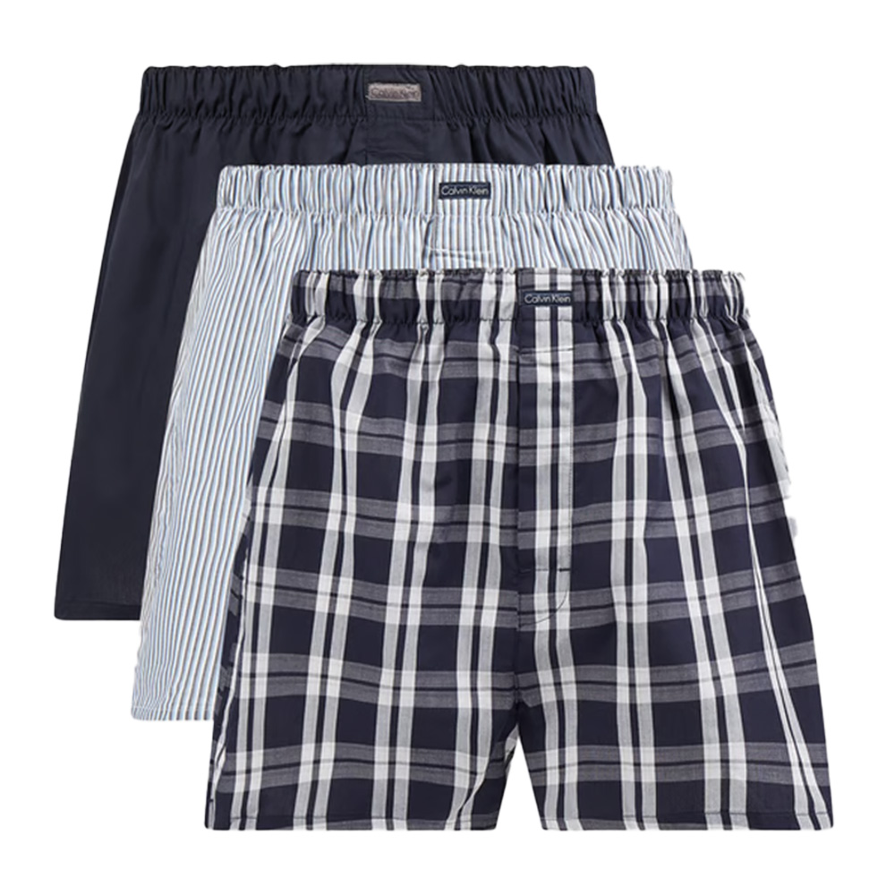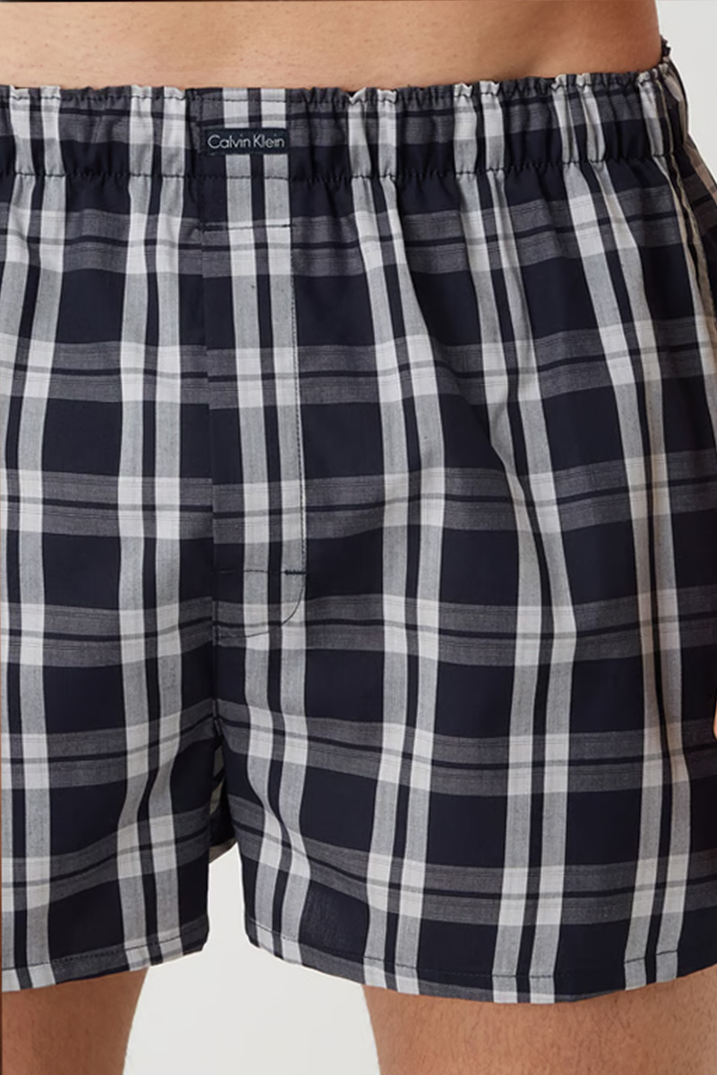 3-pack Calvin Klein boxers slim fit. De verpakking bestaat uit drie wijde shorts. Een gestreepte, effen donkerblauwe en een met ruiten. De wijde boxers hebben een elastische tailleband en zijn gemaakt van 100% katoen.