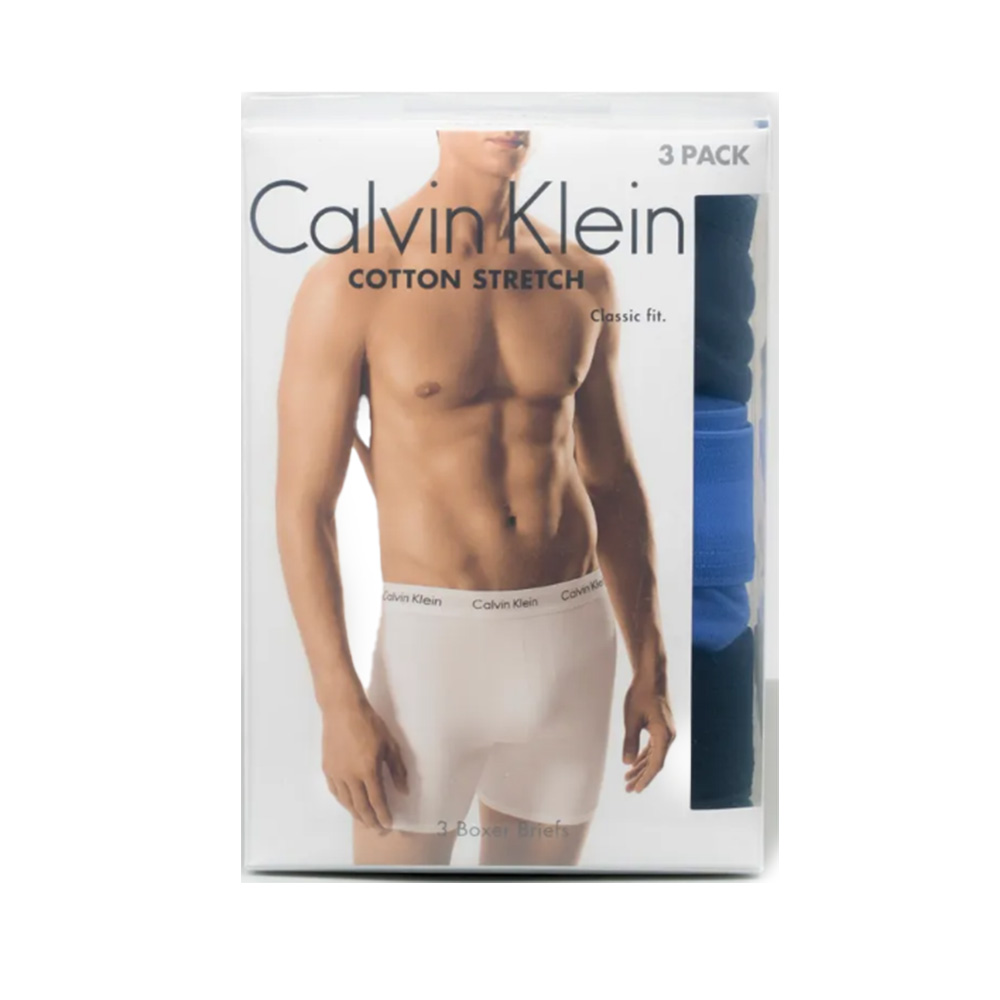 De verpakking bevat drie effen blauwe boxershorts. Daarnaast zijn ze voorzien van een elastische tailleband met het Calvin Klein logo hierin verwerkt. Ook hebben de shorts lange pijpjes.