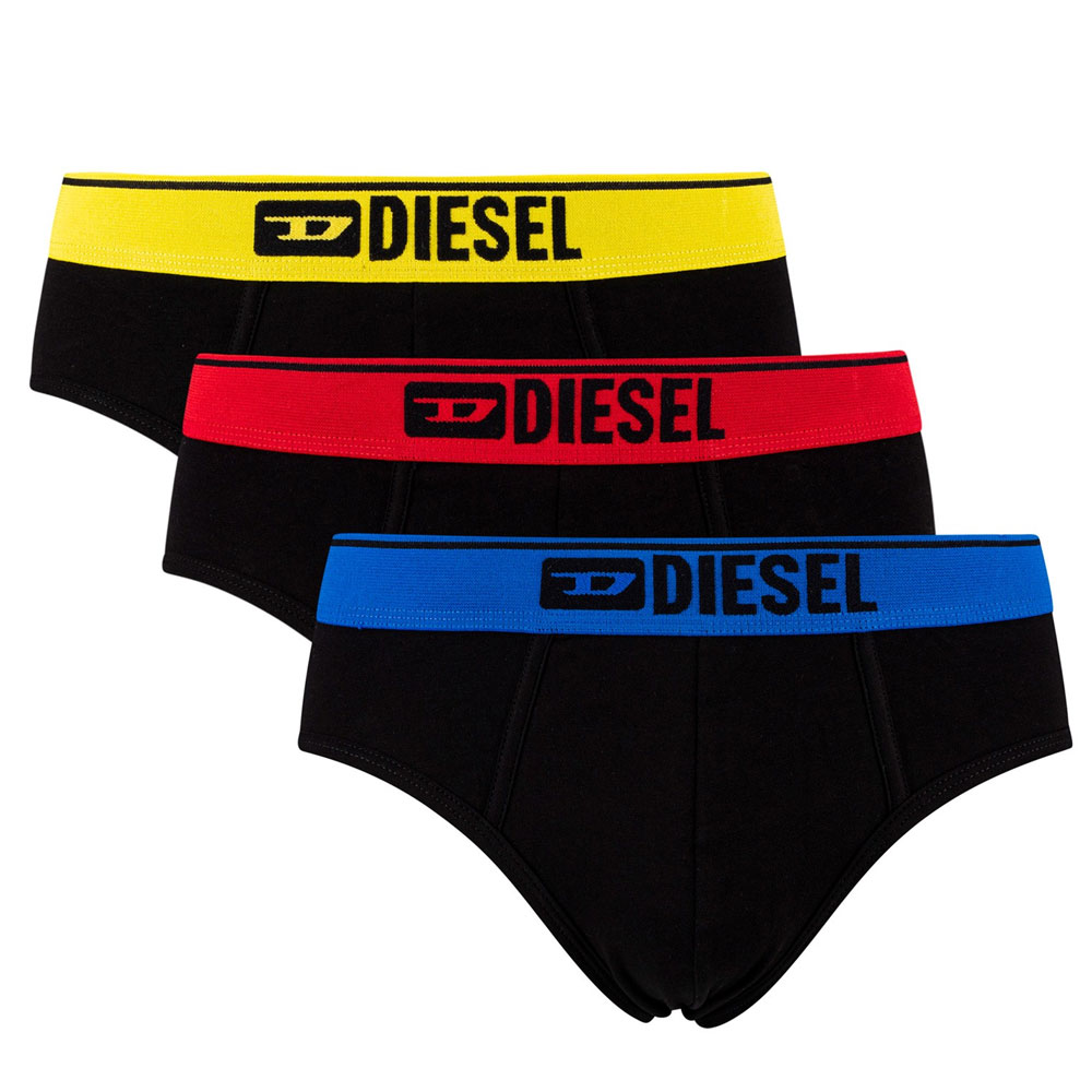 In deze verpakking zitten drie effen zwarte herenslips met een rode, gele en blauwe tailleband. In de tailleband is het Diesel logo verwerkt. De slips dragen comfortabel dankzij het gebruik van stretch katoen. Ook sluiten ze mooi aan op je lichaam.