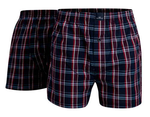 De verpakking bevat twee wijde boxers met ruitpatroon in het blauw met rood. De boxershorts hebben een elastische tailleband met hierin een label met het merklogo er op. Daarnaast zijn ze voorzien van een gulp met knoopsluiting en zijn ze gemaakt van 100% katoen.