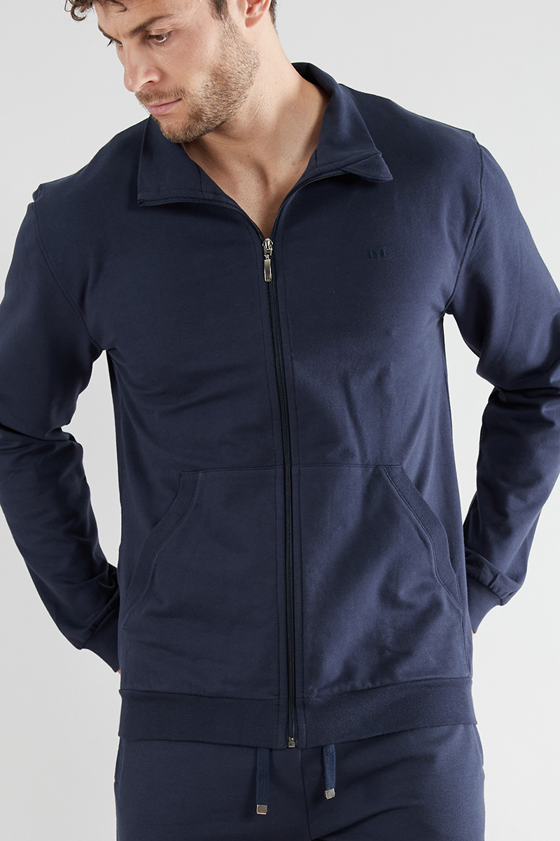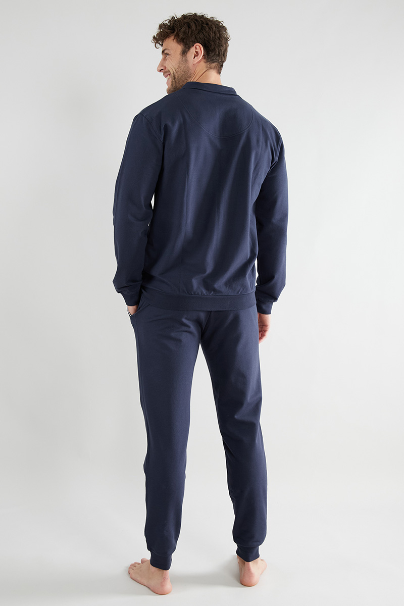 Ontdek het ultieme loungecomfort met dit donkerblauwe Gotzburg huispak, gemaakt van zachte sweatstof. Perfect voor ontspannen dagen of een casual outfit! Dit pak heeft subtiele witte markeringen op de zakken en een handige ritssluiting in het vest voor extra gemak! Met dit zachte huispak heb je alle comfort!