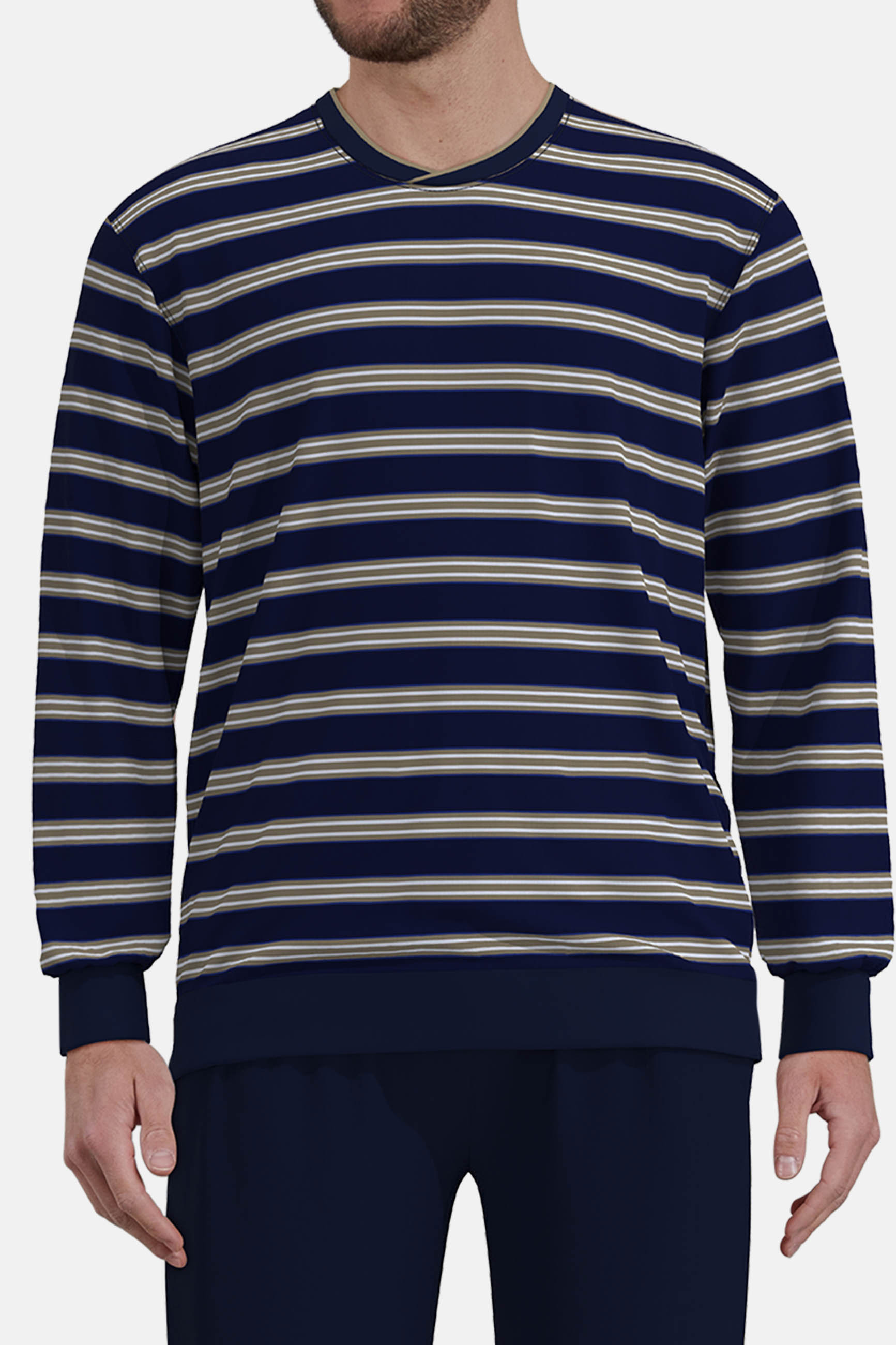 De pyjamaset bestaat uit een gestreepte trui met boorden en een donkerblauwe broek met elastische boorden – perfect voor een comfortabele pasvorm die niet verschuift tijdens de nacht. Dankzij de natuurlijke, huidvriendelijke katoenvezels voelt de stof niet alleen zacht en soepel aan, maar is hij ook ademend en vriendelijk voor de huid.