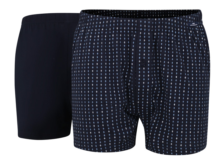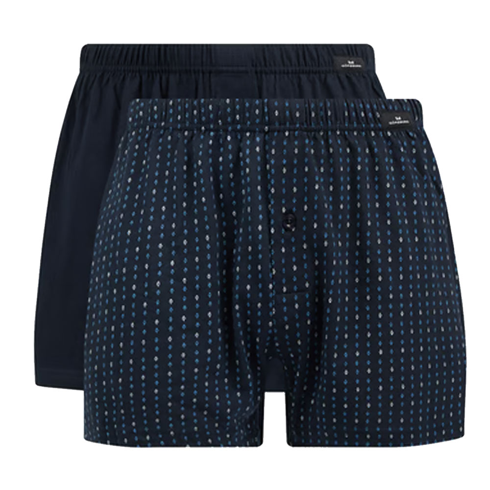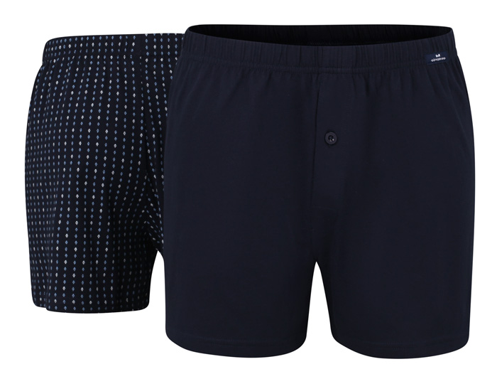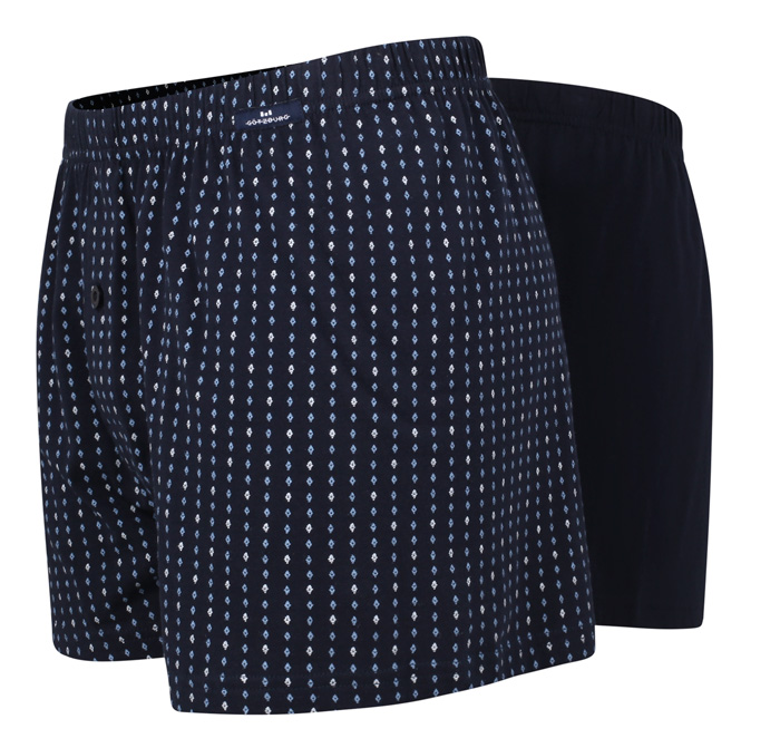 De verpakking bevat een effen blauwe boxershort en een blauwe met all over wit en blauwe print. De wijde boxers hebben een elastische tailleband met hierin een klein label met het merklogo er op.Daarnast zijn de boxers voorzien van een gulp met knoopsluiting en zijn ze gemaakt van 100% katoen.