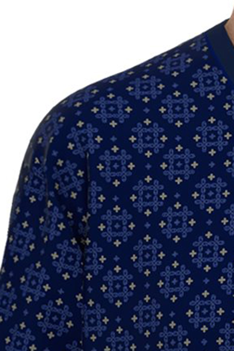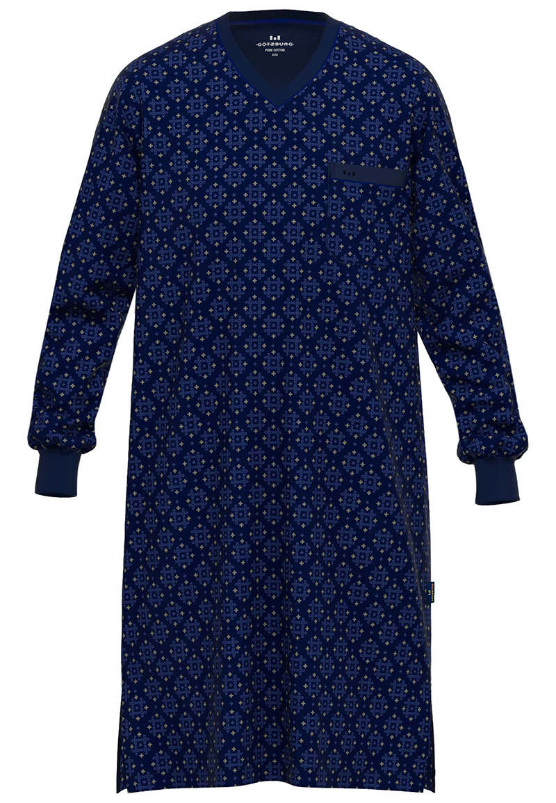 Dit donkerblauwe nachthemd van Gotzburg combineert comfort met een elegante uitstraling. Het hemd is gedecoreerd met een subtiele all-over print in lichtblauw en okergeel, wat een verfijnde look creëert. De V-hals en het borstzakje wat voor een mooie accentuering zorgt. Aan de onderzijde van het nachthemd zijn twee splitjes aangebracht, en de mouwen zijn voorzien van comfortabele boorden. Dit nachthemd biedt veel bewegingsvrijheid en houdt je tegelijkertijd heerlijk warm.