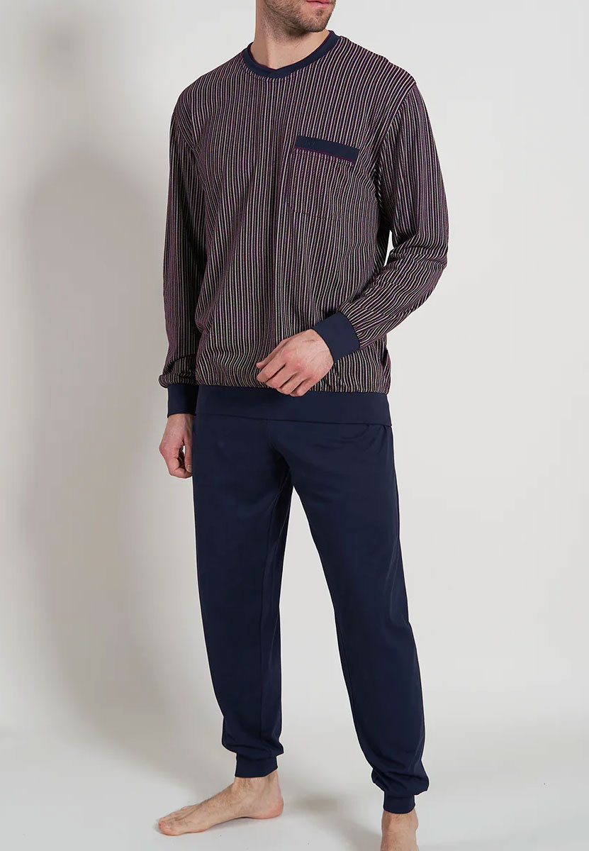 Mooie pyjama van Gotzburg met print. De pyjama set bestaat uit een lange donkerblauwe pyjamabroek met elastische tailleband en een rood-blauw lang mouwen shirt met witte blokjes.
