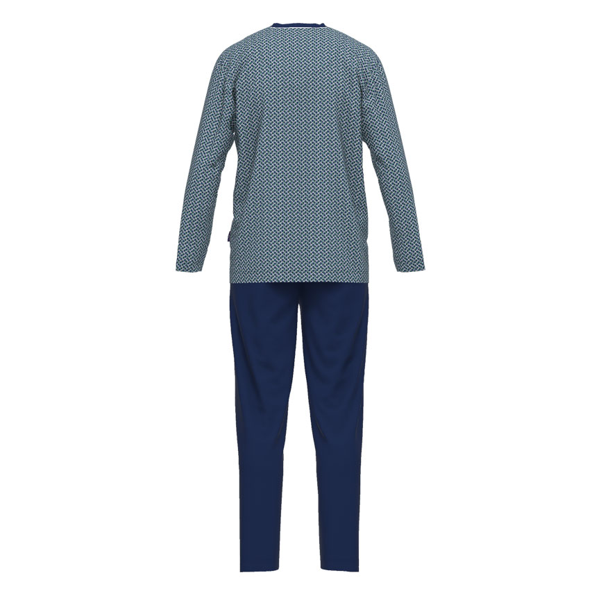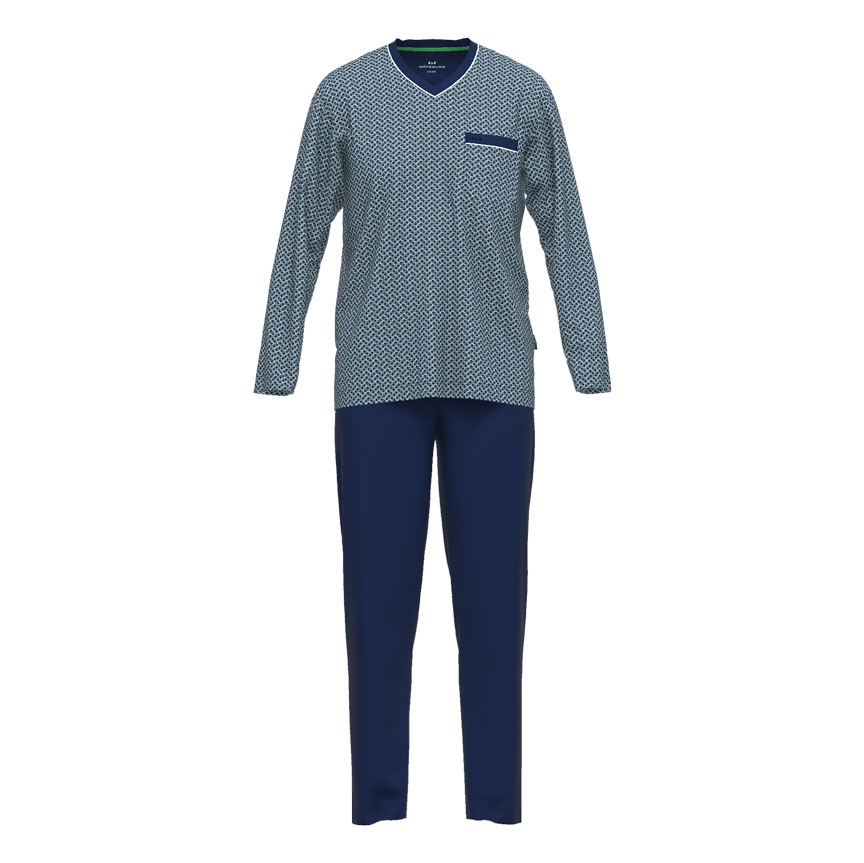 V-hals pyjama van Gotzburg. De pyjama bestaat uit een donkerblauwe pyjamabroek met elastische tailleband en een v-hals trui met lange mouwen en een zakje op de borst. De top heeft een donkerblauwe kleur met een groen/blauw motief.