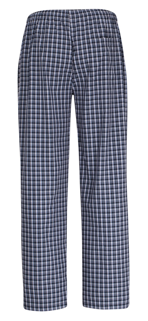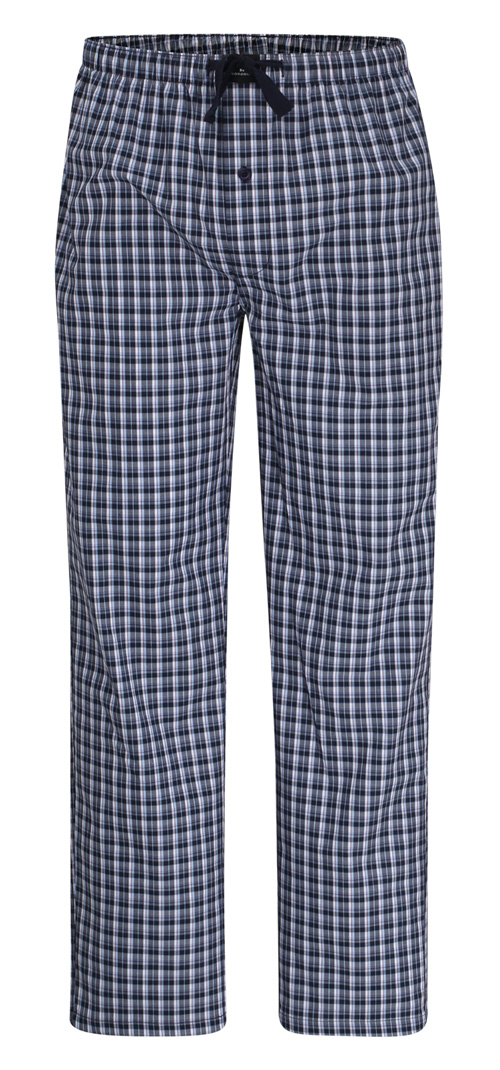 De lange pyjamabroek is voorzien van een blauw ruitpatroon. Hij heeft een elastische tailleband met veterkoord voor extra comfort. Ook heeft de pyjamabroek een gulp met knoop.