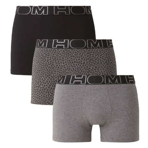 Hom boxershorts Bruce 3-pack. In deze verpakking zit een effen zwarte en grijze boxer en zwarte boxershort met dynamische print. Ze hebben een elastische tailleband met Hom merklogo hierin verwerkt. Een van de shorts bevat dezelfde dynamische print in de tailleband. Daarnaast zijn de boxershorts gemaakt van stretch katoen, dragen ze comfortabel en hebben ze een aansluitende pasvorm.