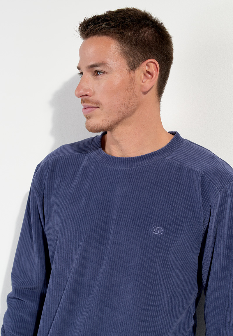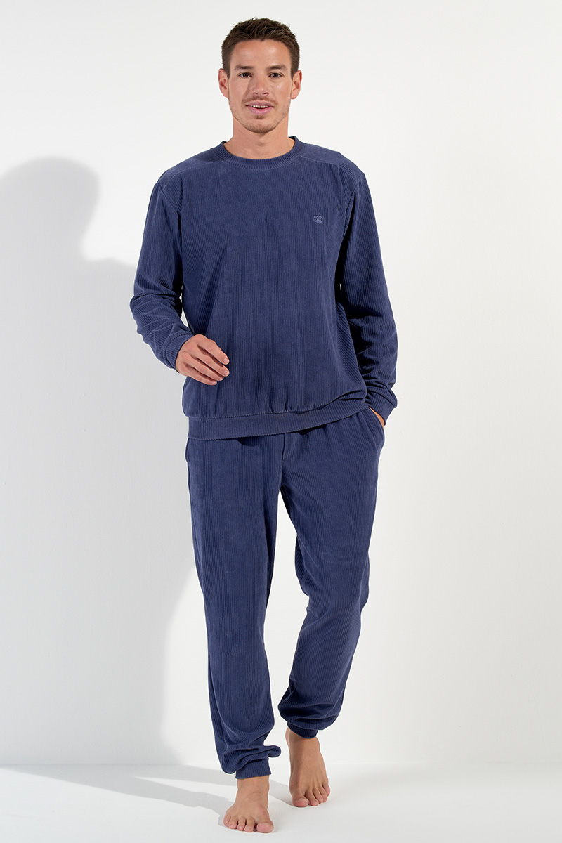 De set bestaat uit een effe blauwe blauwe broek met elastische taille en een blauwe trui met lange mouwen en een ronde hals. Daarnaast is de trui voorzien van boorden. Zo komt er geen kou naar binnen en blijf jij lekker warm! Ontspannen doe je in dit huispak van Hom.