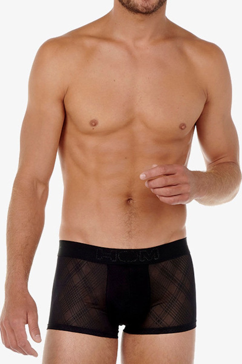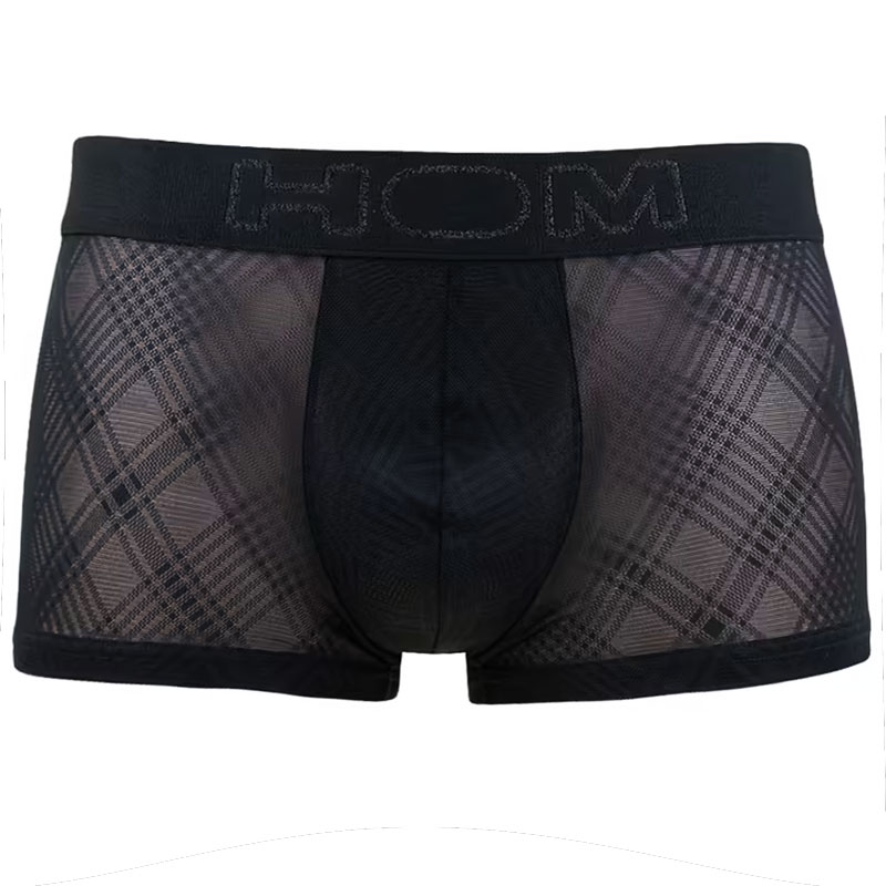 HOM Temptation met unieke look. Zwarte boxershort met kant effect en ruit print. Gemaakt van polyamide en elastan. Verleidelijk ondergoed voor mannen van HOM.