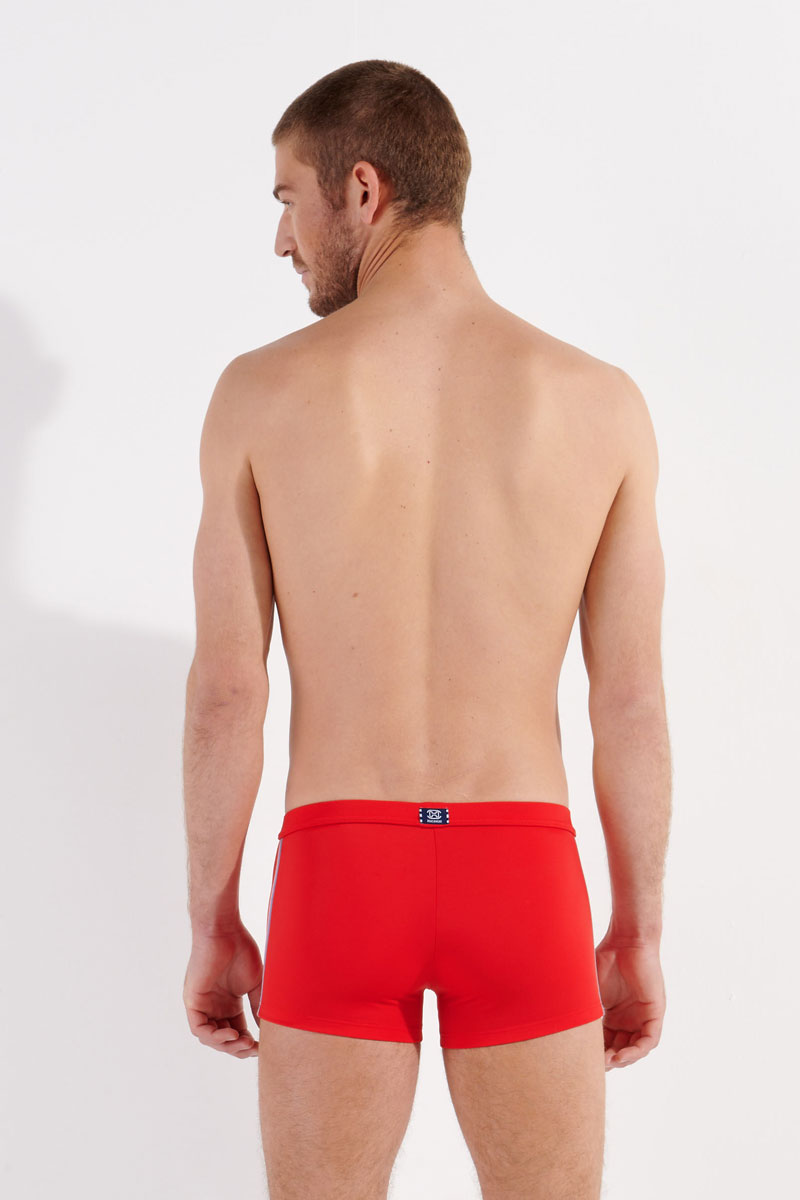 Hom zwemboxer Nautical cup red voor heren is ontworpen in stijl en comfort. Deze zwemshort heeft een inkeping op de heup en een tailleband die dunner is dan die van de andere modellen van het merk. De Nautical cup herenzwemshort wordt aan de voorkant vastgebonden met een trekkoord in de stof van de elastische tailleband, versterkt aan de uiteinden.
