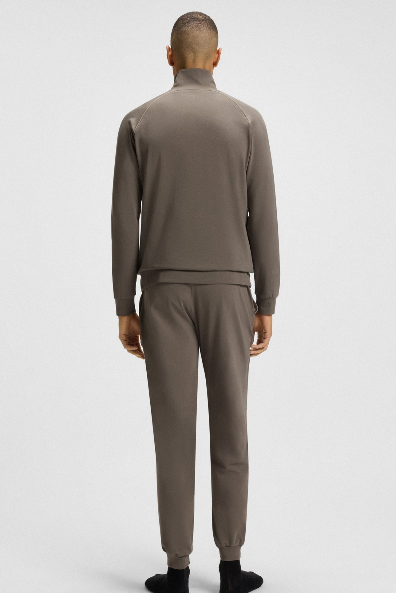De broek is uitgevoerd in klassiek bruin en afgewerkt met verfijnde details, zoals een elastische tailleband met trekkoord waarin subtiel het Hugo Boss-logo is verwerkt. Het herkenbare logo komt ook terug als stiksel onder de linkerzak, wat zorgt voor een stijlvolle, premium uitstraling. De geribde boorden aan de enkels geven de broek een moderne pasvorm en een sportieve touch.
