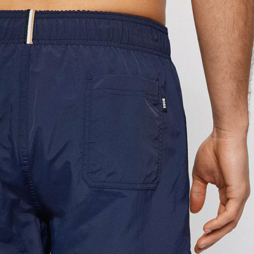 Middellange zwemshorts van BOSS voorzien van binnenbroekje en tailleband met trekkoord. Deze zwembroek Whale is donkerblauw van kleur en zijn gedetailleerd met een groot logo stiksel in ton-sur-ton.