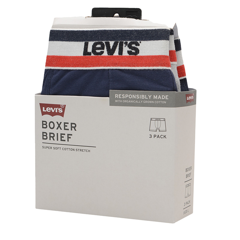 3-pack boxershorts van Levi's. In de verpakking zitten drie boxershorts: blauw en grijs. Ze zijn voorzien van een elastische tailleband gemaakt van biologisch stretch katoen. In de tailleband is het Levi's logo te zien. De shorts hebben een lang pijpje en zijn gemaakt van zacht stretch katoen wat ervoor zorgt dat ze een aansluitende pasvorm hebben en comfortabel dragen. Ook fijn is dat de pijpjes niet omhoog kruipen!