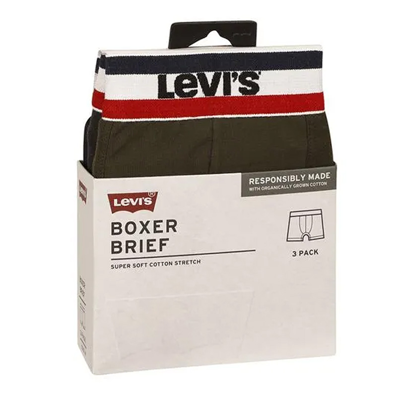 3-pack boxershorts van Levi's. In de verpakking zitten drie boxershorts: blauw, grijs en een groene. Ze zijn voorzien van een elastische tailleband gemaakt van biologisch stretch katoen. In de tailleband is het Levi's logo te zien. De shorts hebben een lang pijpje en zijn gemaakt van zacht stretch katoen wat ervoor zorgt dat ze een aansluitende pasvorm hebben en comfortabel dragen. Ook fijn is dat de pijpjes niet omhoog kruipen!