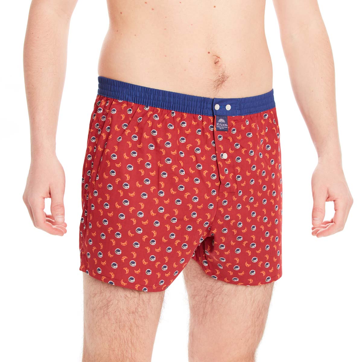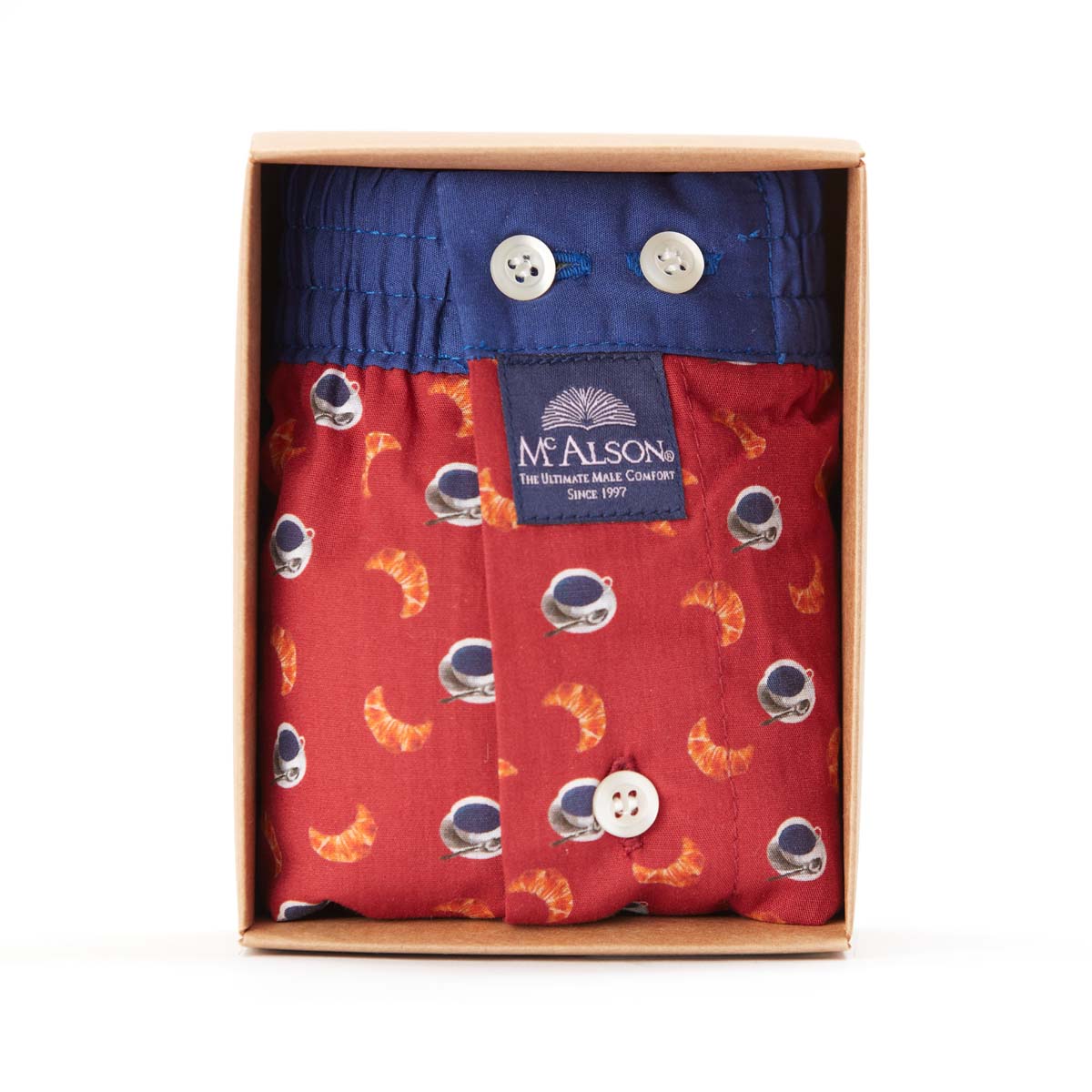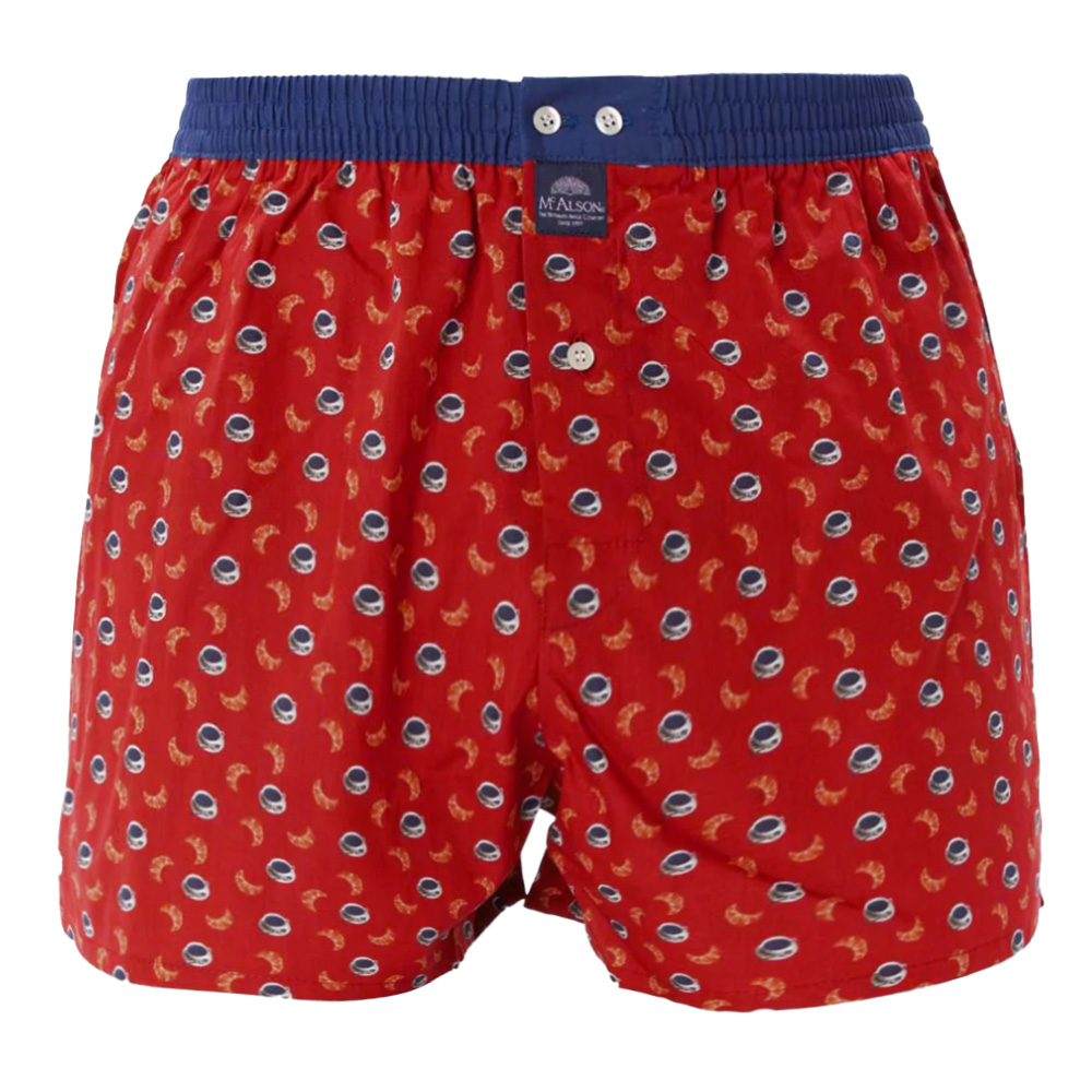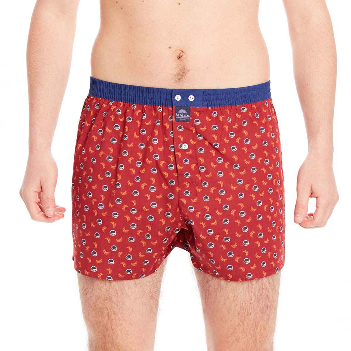 Kleurrijke McAlson boxer met binnenbroek! Deze wijde boxershort in rood met croissant motief en een donker blauwe elastische tailleband met twee knopen en een McAlson merk label. Aan de zijkanten heeft de boxer een split. Daarnaast heeft hij ook nog een gulp met knoopsluiting en zijn de stoffen gemaakt van geweven katoenvezels.