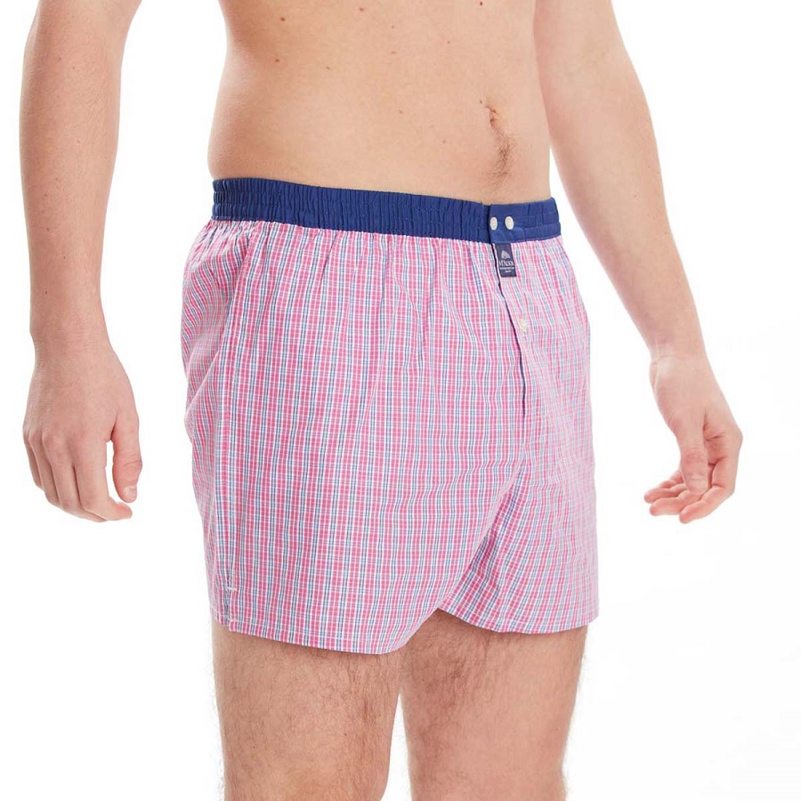 Dit is een wijde boxer met binnenbroek. De herenboxer is voorzien van een elastische tailleband met twee knopen. Alle stoffen zijn gemaakt van geweven katoenvezels. Aan de zijkant heeft de boxer een split. Daarnaast heeft hij ook een gulp met knoopsluiting en een Mc Alson merk label aan de voorkant onder de tailleband.