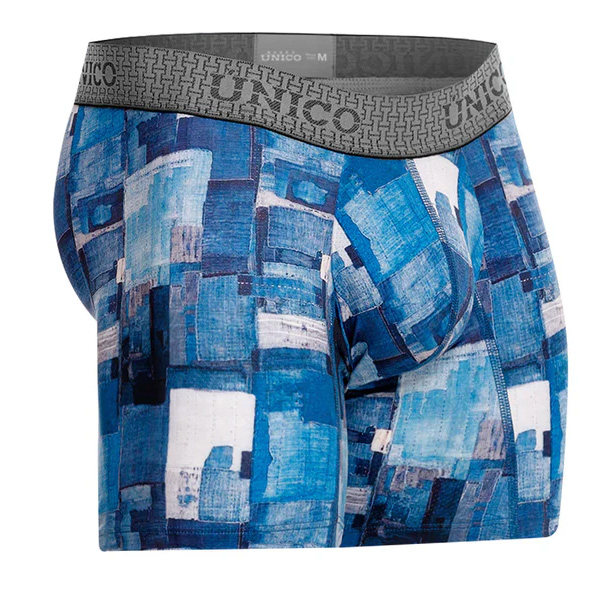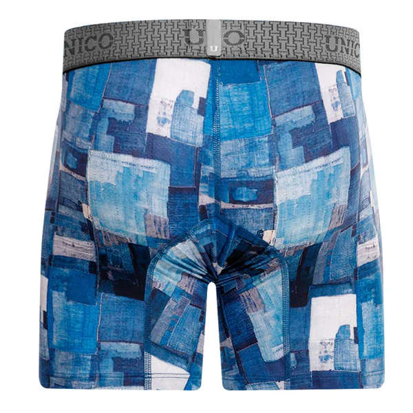 boxershort in lange uitvoering biedt een stijlvolle look met een blauw patchwork-design en een comfortabele grijze tailleband. De soepele, ademende stof en ergonomische pouch zorgen voor optimale ondersteuning en bewegingsvrijheid. Gemaakt van 80% polyester en 20% elastaan voor een perfecte pasvorm.