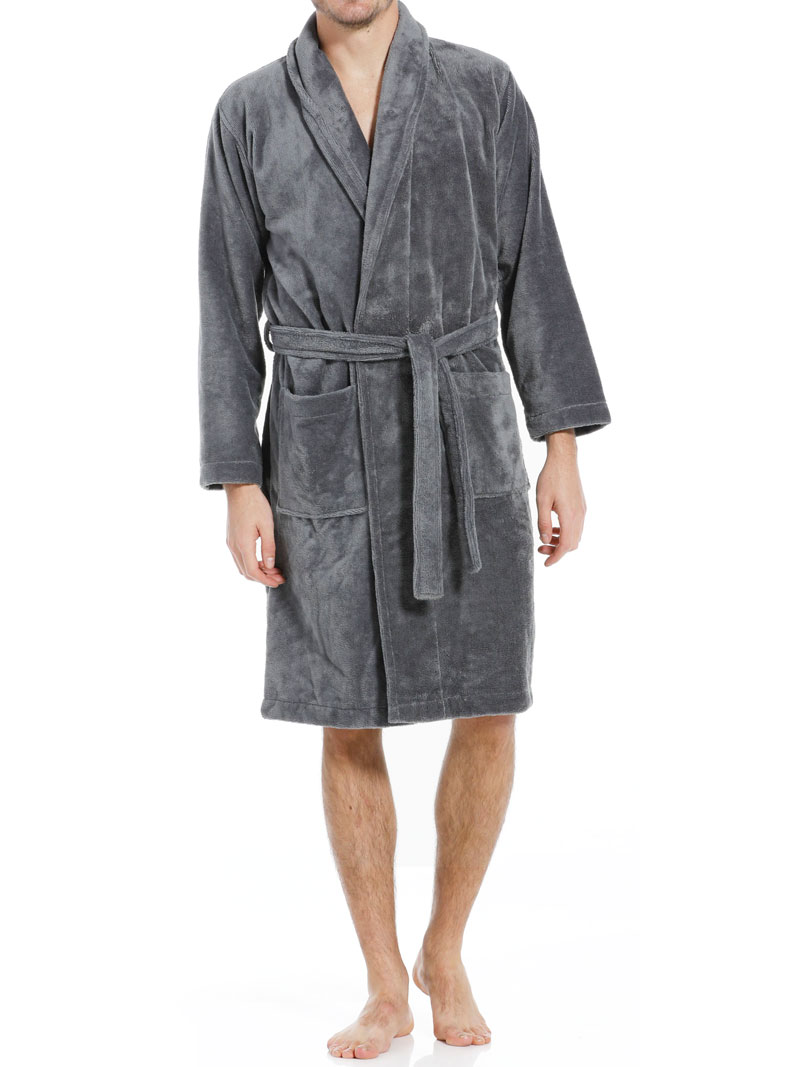 De badjas is grijs van kleur en is voorzien van een heerlijk warme shawlkraag. Ook heeft hij twee steekzakken aan de voorkant en een ceintuur waarmee je de badjas de juiste pasvorm kan geven. De buitenkant is gemaakt van polyester fleecen en de binnenkant van badstof
