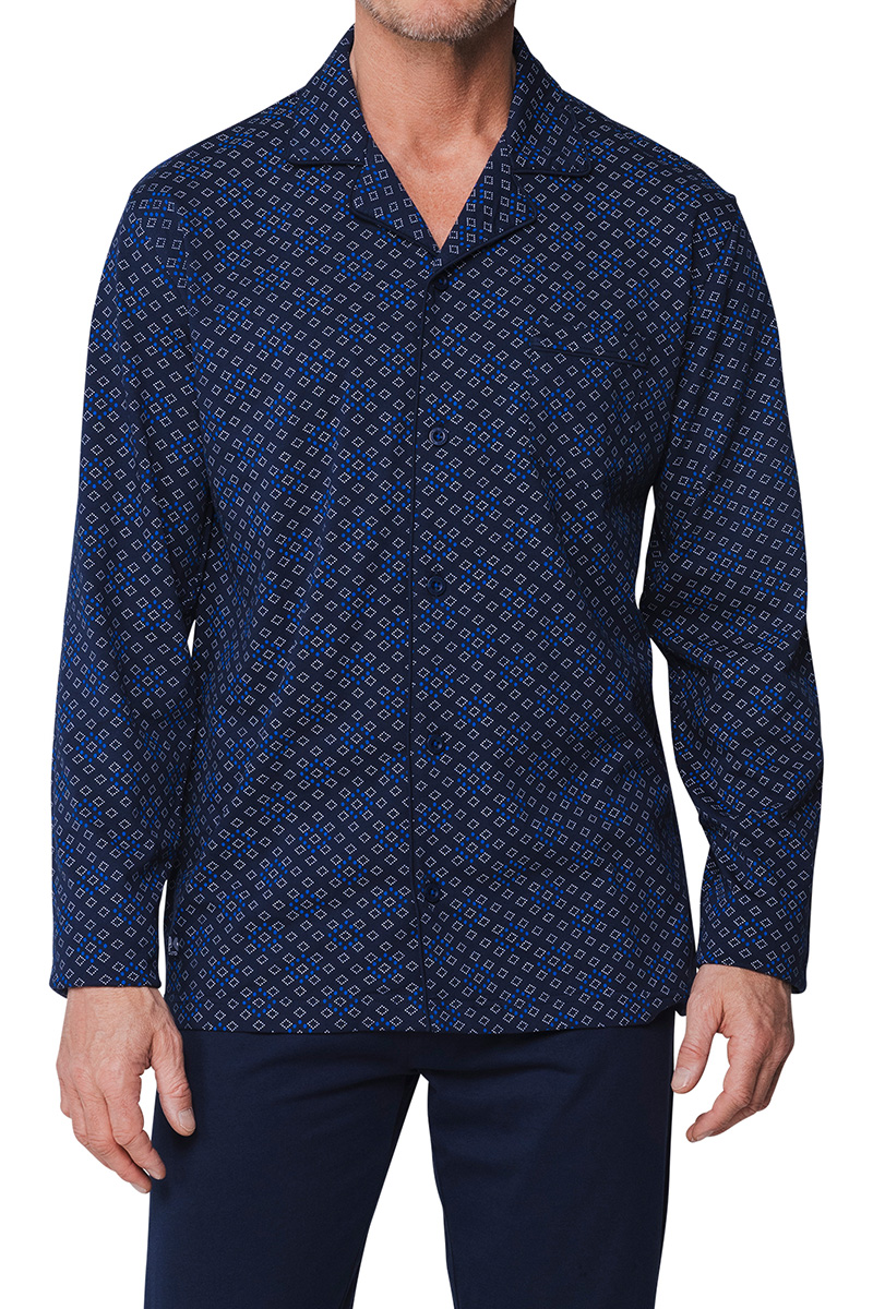 Het subtiele design op de stof geeft de pyjama een modieuze en unieke look, terwijl de lange broek met elastische tailleband zorgt voor een fijne pasvorm en veel bewegingsvrijheid.