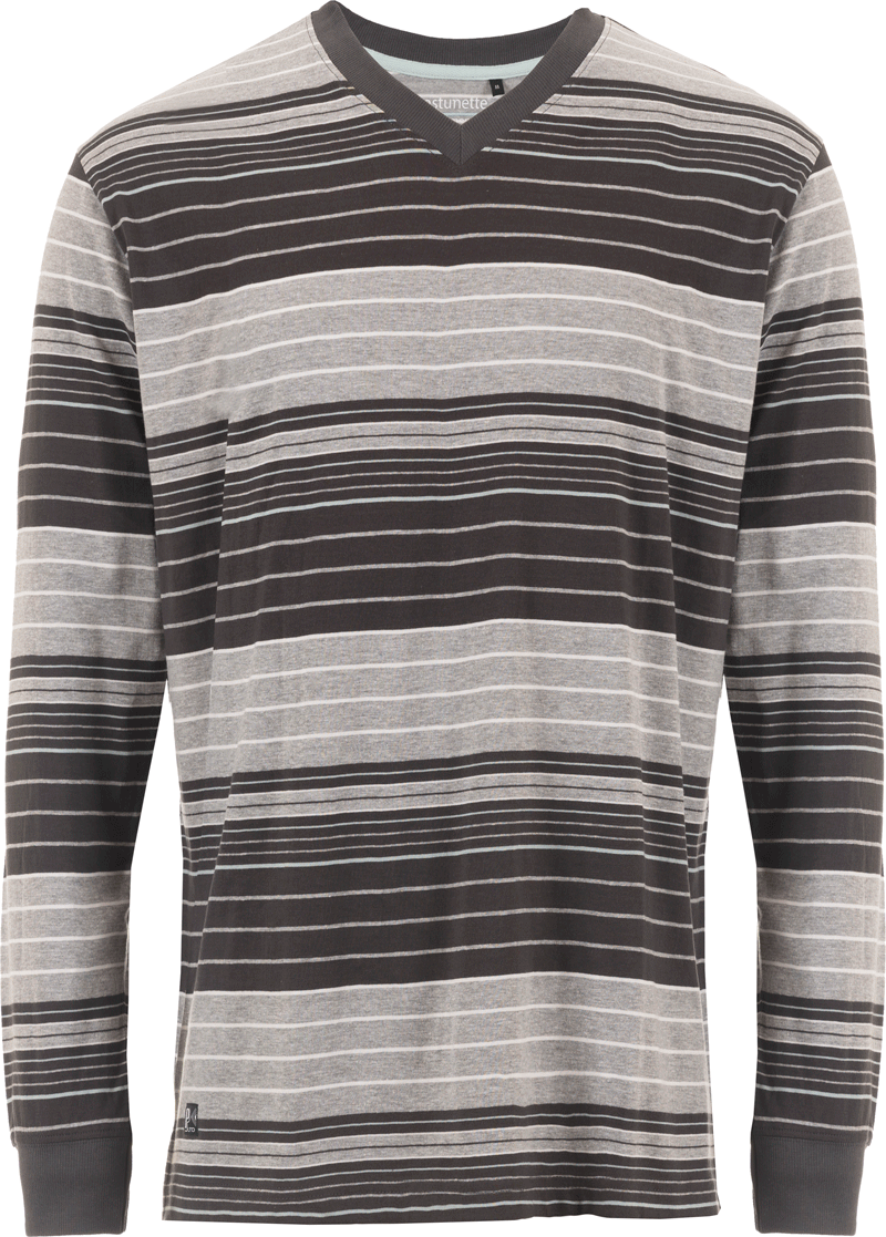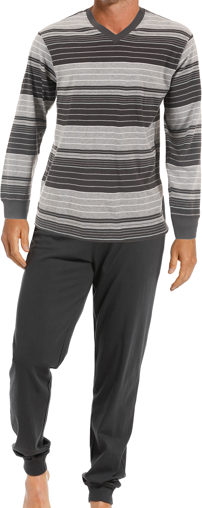 Deze herenpyjama bestaat uit een grijze pyjamabroek en een pyjamashirt met lange mouwen, een V-hals en een zwart met grijs streeppatroon.