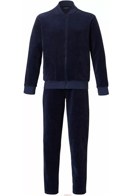 Heren huispak in een mooie zachte velours kwaliteit van het merk Pastunette. Jasje is voorzien van rits, 2 steekzakken en opstaand boordje met boorden, een lange broek met 2 steekzakken.