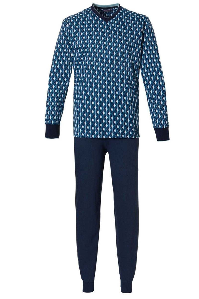 Pastunette herenpyjama met V-hals en boordjes onderaan de armen en benen. Deze herenpyjama is voorzien van een dynamische print in de top en een donkerblauwe broek.