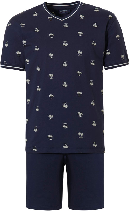 Leuke Shortama met zomerse print van Pastunette. Deze shortama set van Pastunette bestaat uit een korte effen donkerblauwe pyjamabroek en een blauw pyjamashirt met witte palmboom print.  Daarnaast heeft het shirt korte mouwen met witte boordjes en een V-hals. De shortama is een fijne pyjama wanneer je het snel warm krijgt in bed.