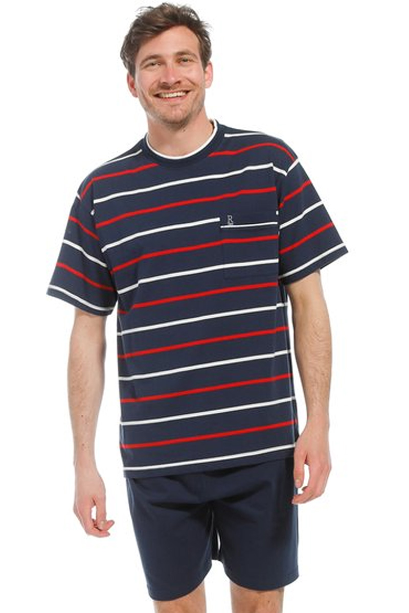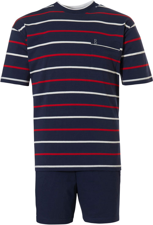 Deze Robson shortama  bestaat uit een donkerblauwe korte pyjamabroek en een shirt met korte mouwen en een ronde hals. Het shirt heeft een borstzakje met Robson logo. Ook is de bovenkant voorzien van witte en rode strepen. Heerlijke pyjama om in te relaxen in de zomer!