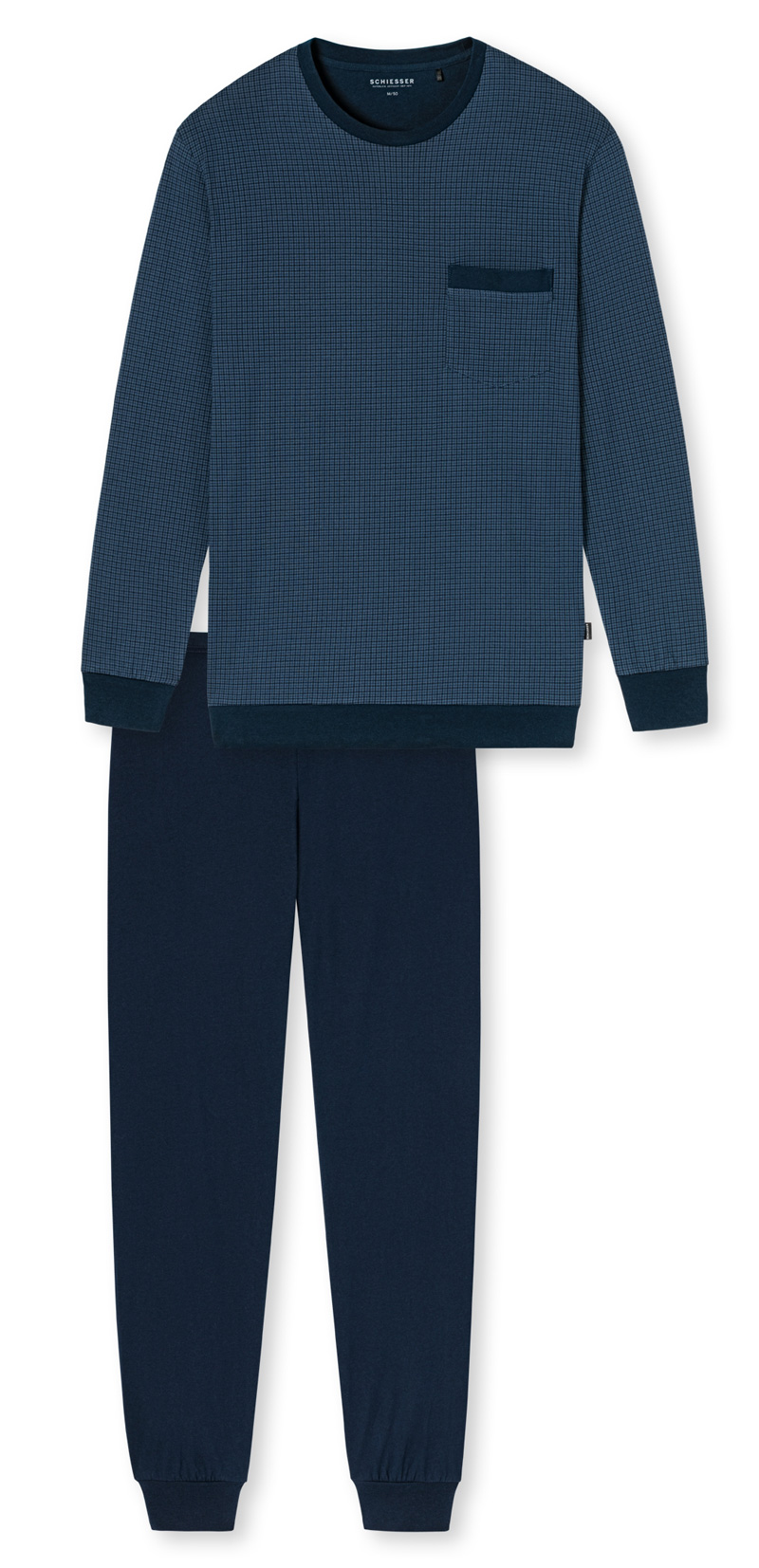 De pyjamaset bestaat uit een donkerblauwe lange pyjamabroek en een blauw lang mouwen shirt met blokjes print. De pyjamabroek is voorzien van een elastische tailleband. Het shirt heeft een ronde hals en een borstzakje. Zowel de broek als het pyjamashirt zijn voorzien van boorden.