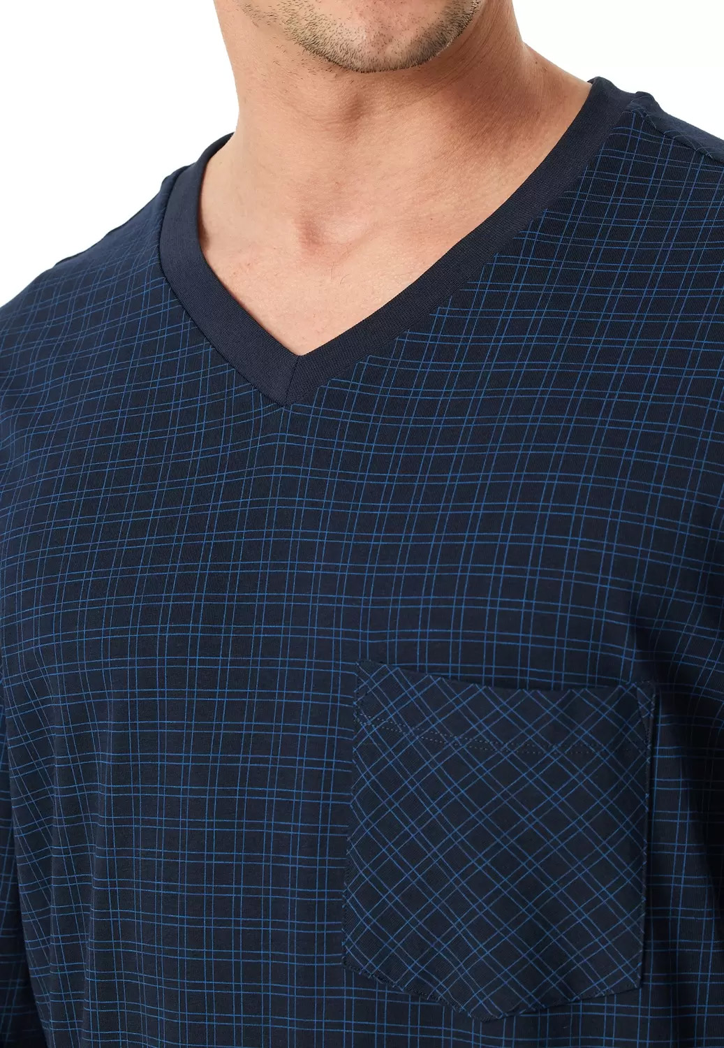 Ontdek ultiem comfort met deze stijlvolle lange herenpyjama uit de Schiesser Comfort Essentials-serie. Gemaakt van 100% hoogwaardig katoen in soepel vallende Single Jersey-kwaliteit, biedt deze pyjama een perfecte combinatie van zachtheid, ademend vermogen en bewegingsvrijheid. Het stijlvolle shirt met lange mouwen heeft een modern, minimalistisch patroon, een ronde hals en een handige borstzak, terwijl de effen blauwe broek is voorzien van een comfortabele tailleband voor een perfecte pasvorm. Dankzij de zachte manchetten blijft alles goed op zijn plek, zodat je ongestoord kunt ontspannen en genieten van een goede nachtrust. Ideaal voor heren die op zoek zijn naar kwalitatieve nachtkleding met een tijdloze uitstraling.