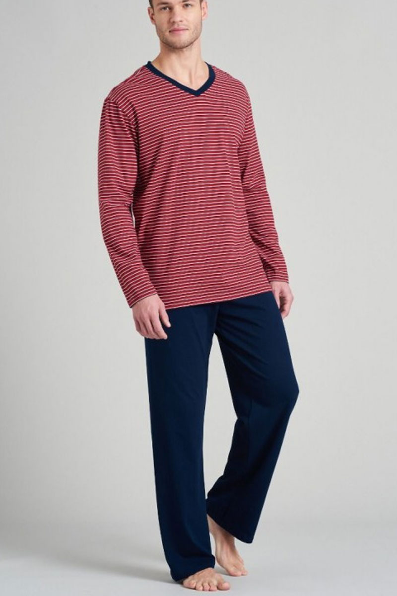 De pyjamaset bestaat uit een lange effen blauwe broek en een lang mouwen shirt. De pyjamabroek heeft een elastische tailleband en wijde pijpen. Het rode pyjamashirt heeft een V-hals en blauwe en witte strepen. De pyjama is gemaakt van single jersey in 100% katoen en draagt comfortabel.