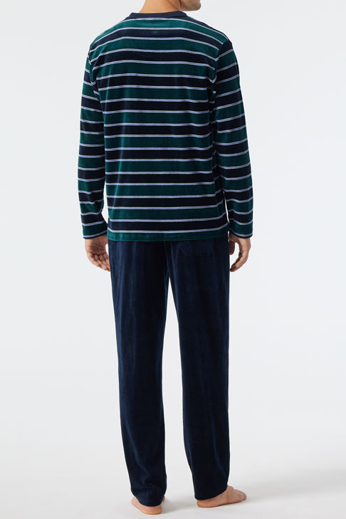Een mannelijk tweedelig pak dat rustgevende nachten belooft: deze lange herenpyjama combineert hoogwaardig en verwarmend Velours met een modieus ontwerp. Door het hoge katoengehalte is de stof bijzonder huidvriendelijk en warmteregulerend. De top met V-hals wordt perfect aangevuld door de effen broek met bindkoord - een droomduo dat over de hele lijn overtuigt.