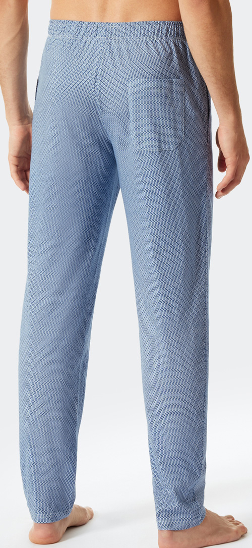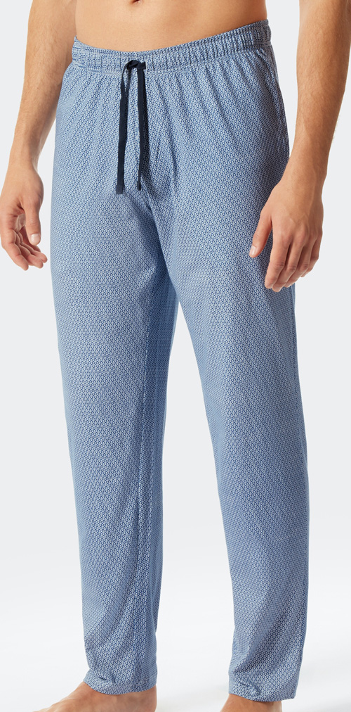 Mooie pyjamabroek van Schiesser. Deze lange, blauwe pyjamabroek is voorzien van een modern wit patroontje. Hij heeft een elastische tailleband met donkerblauw lint en zijdelingse steekzakken. Het zachte jersey materiaal van 100% katoen zorgt voor een bijzonder aangenaam gevoel op de huid en een losse pasvorm. In deze comfortabele pyjamabroek van uitstekende Schiesser kwaliteit kan je heerlijk ontspannen!