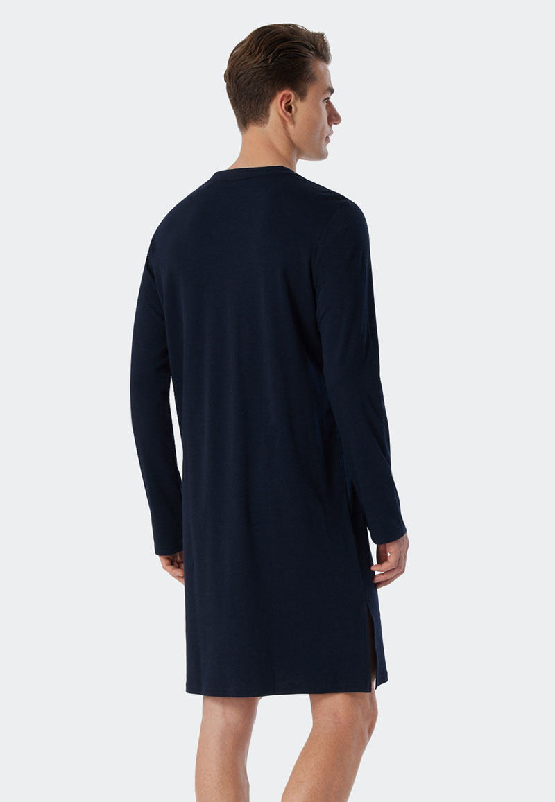 Mannelijk en comfortabel, dit donkerblauwe heren nachthemd voldoet aan al uw wensen. Dankzij de hoogwaardige interlock van 100% katoen en de zijsplitten aan de zoom zit het bijzonder comfortabel. De V-halslijn en het borstzakje zijn fijn afgewerkt met witte biesjes. Een elegante klassieker van de beste kwaliteit!