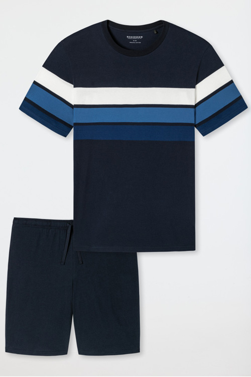 Frisse shortama van Schiesser. Deze pyjamaset bestaat uit een korte donkerblauwe pyjamabroek met elastische tailleband en bindkoord en een pyjamashirt met korte mouwen en een ronde hals. Het shirt is voorzien van blokstrepen in verschillende tinten blauw. De shortama is gemaakt van zachte single jersey met 100% biologisch katoen. Fijne pyjama met hoog draagcomfort en uitstekende Schiesser kwaliteit!