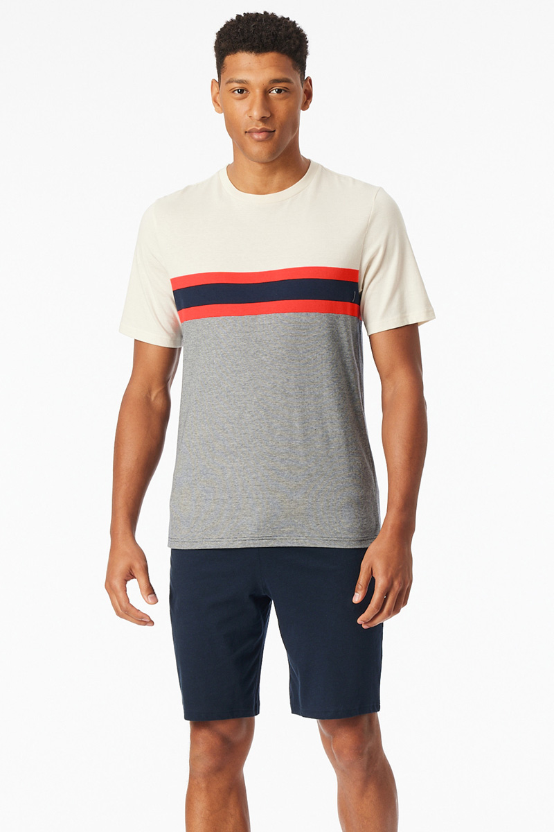 Het T-shirt is uitgevoerd met geplaatste strepen in lichtrood, wit en donkerblauw een frisse en mannelijke kleurcombinatie die moeiteloos stijl uitstraalt. De effen donkerblauwe short is voorzien van een praktische tailleband met striksluiting voor een perfecte pasvorm en extra comfort.