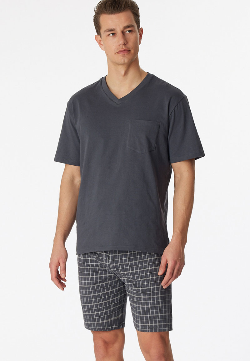 Schiesser Shortama effen V-hals shirt met geruite broek.