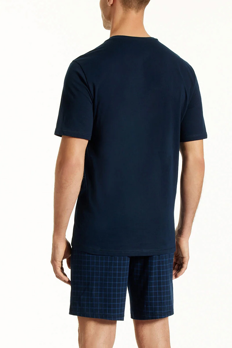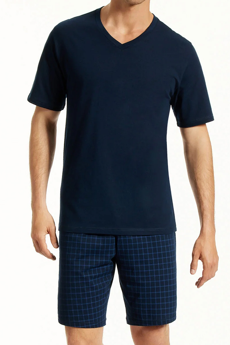 De pyjamaset bestaat uit een korte blauwe broek met ruitpatroon en elastische tailleband en een effen blauw shirt met korte mouwen. Het pyjamashirt is voorzien van een V-hals. De pyjama is gemaakt van zachte single jesey van 100% katoen.