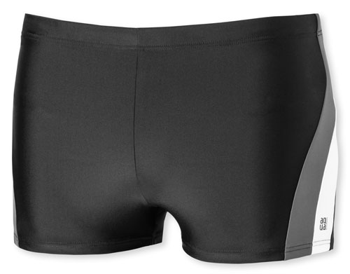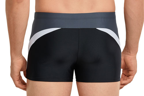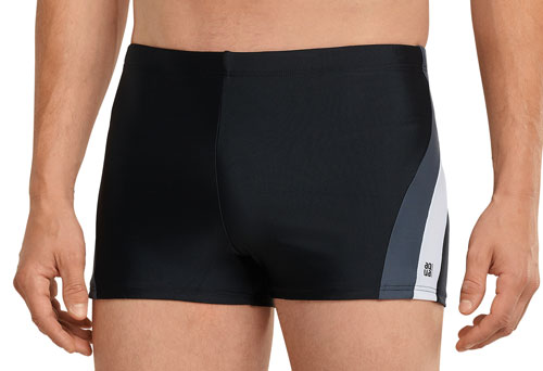 De nauwsluitende zwemshort is zwart van kleur en voorzien van grijze en witte strepen aan de zijkant. De zwembroek is voorzien van een comfortabele binnenslip dat zorgt voor een aangenaam gevoel tijdens het dragen. Ook heeft de short een tailleband met koordsluiting aan de binnenkant. Er zit een klein Schiesser aqua label onder de tailleband. Dit sportieve model is ook verkrijgbaar in het blauw.